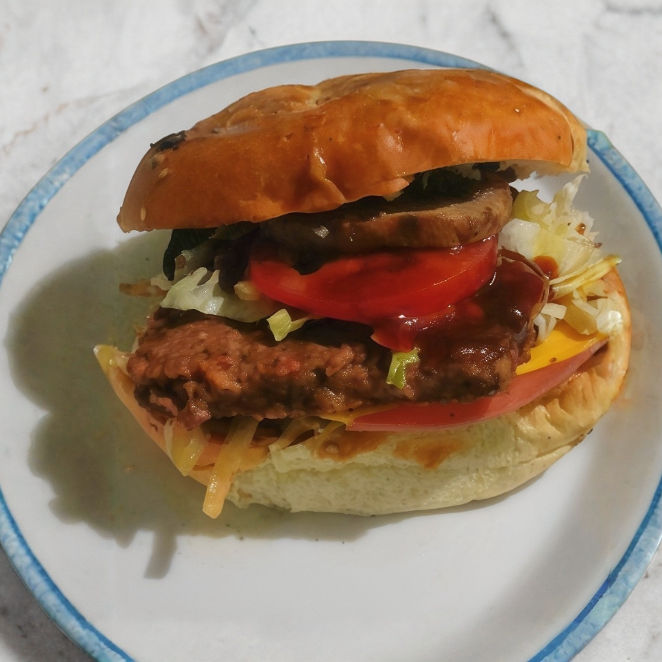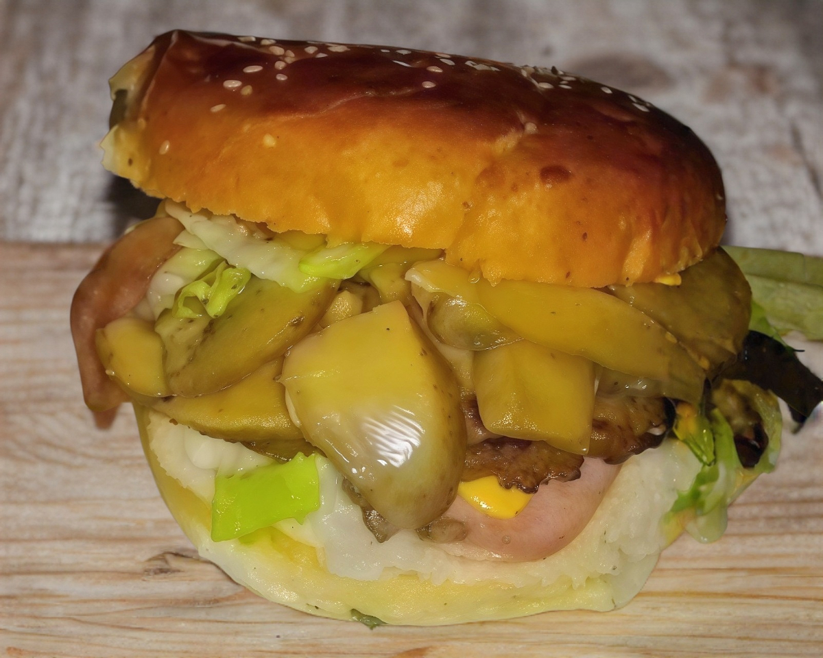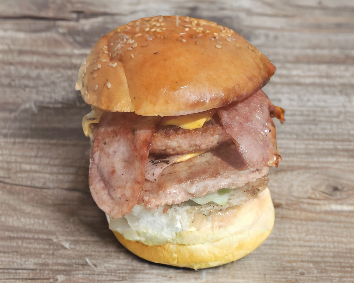 Doble carne jamón queso cebolla aderezos jalapeños vegetales frescos
