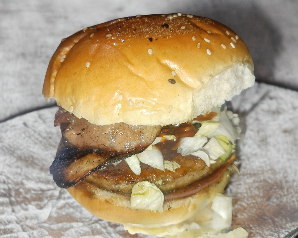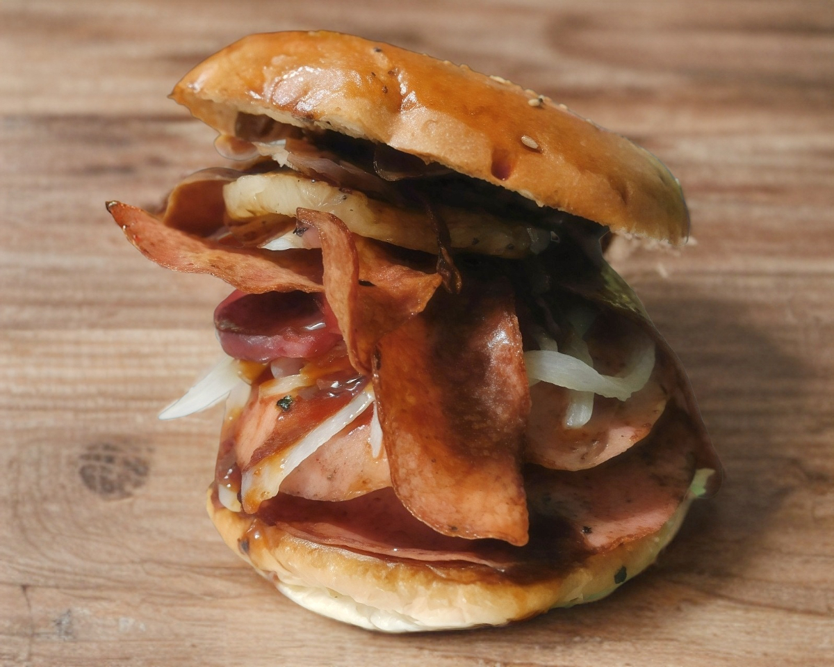 Carne de res tocino piña asada salsa BBQ vegetales y aderezos