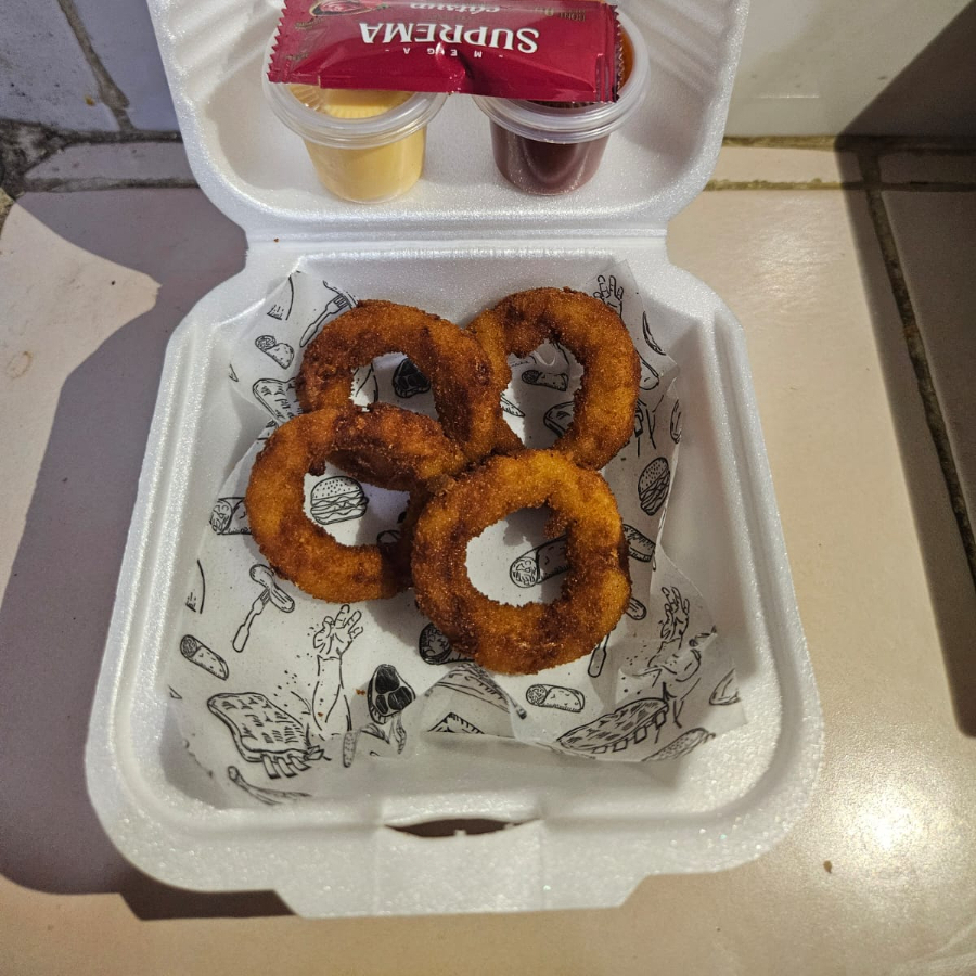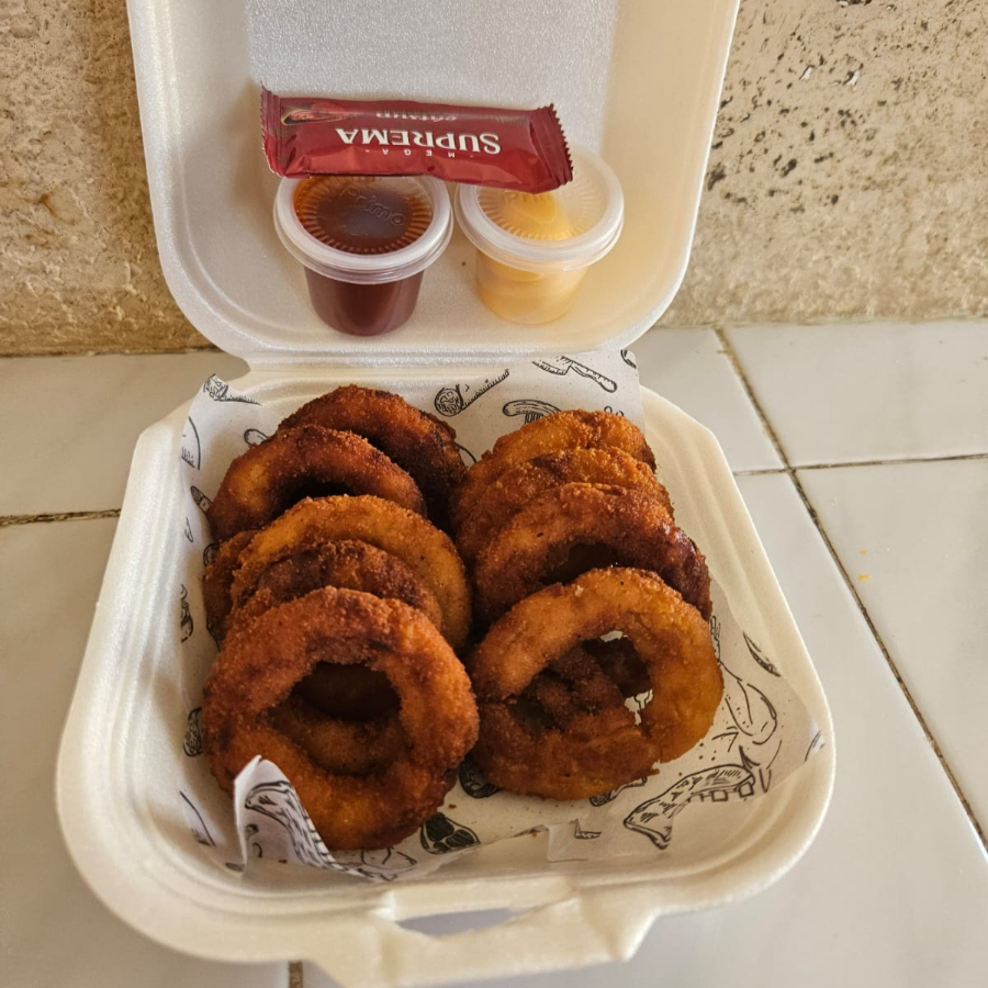 Ricos aros de cebolla empanizadas y crujientes, acompañados de queso cheddar, catsup y salsa picante.