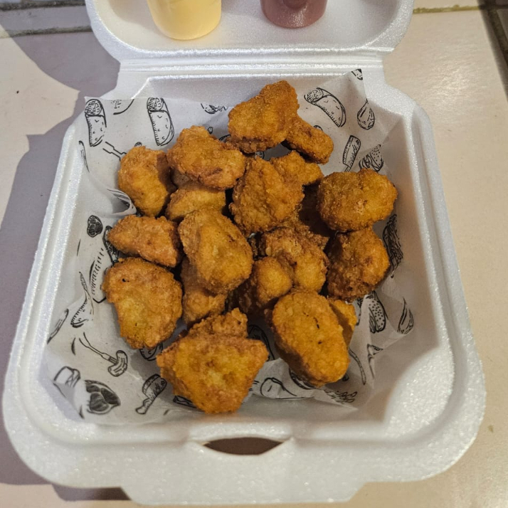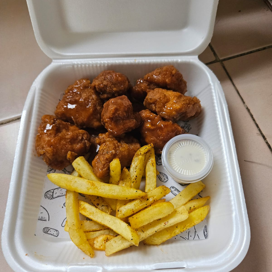 Pechuga cortados en trozos , marinas en especias , empanizadas y fritas , bañadas de aderezo lemon pepper, incluye aderezo y una porcion de francesa , NO INCLUYE VEGETALES