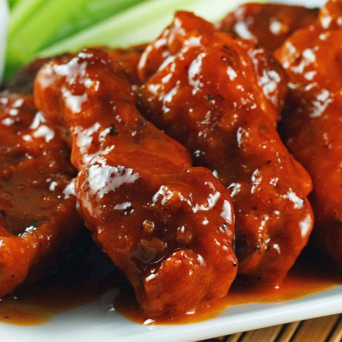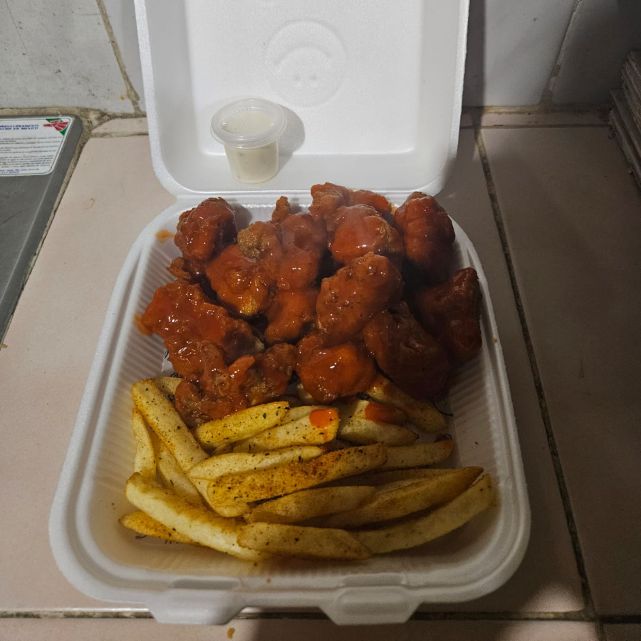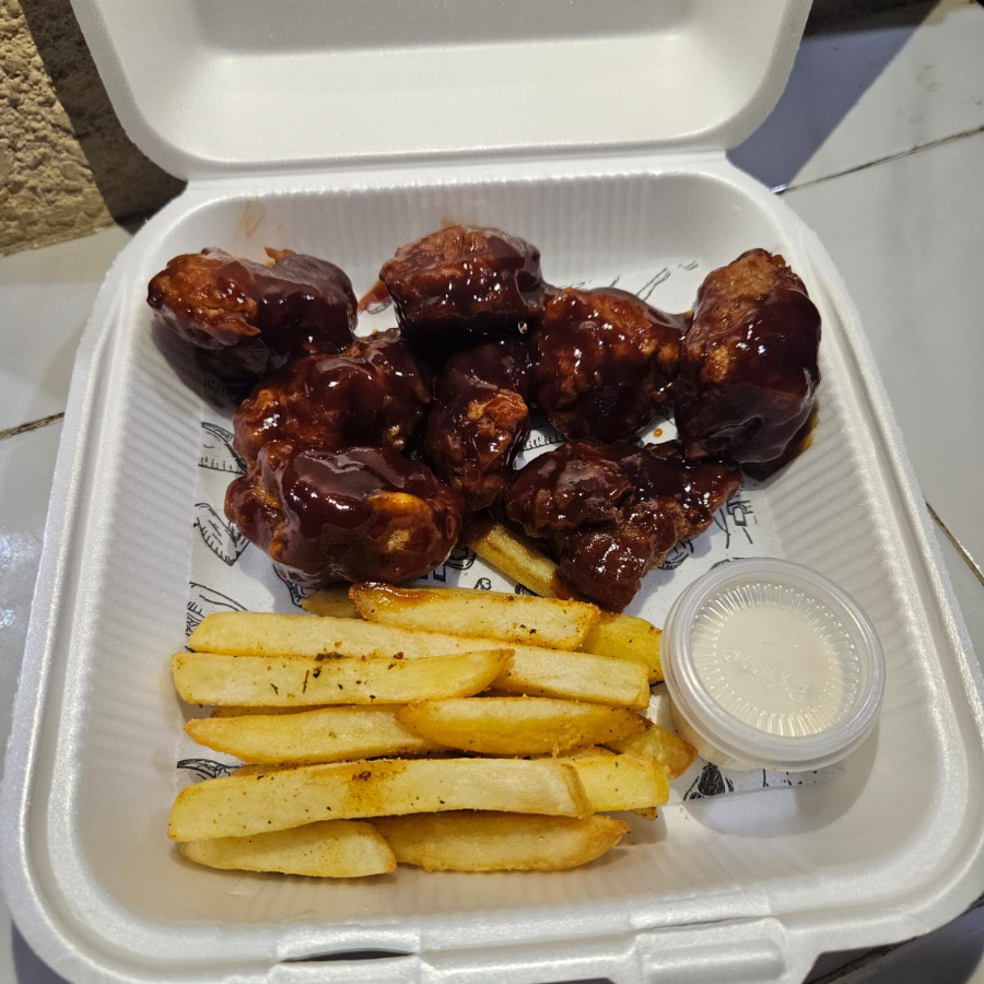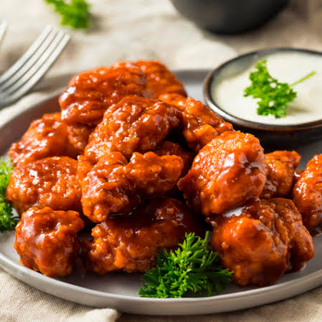 Ricos trozos de pechuga marinada con especias , empanizados y fritos , bañados de salsa bbq, incluye aderezo ranch , por el momento no se envía con bastones de zanahoria y apio.