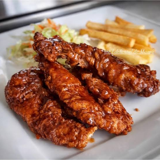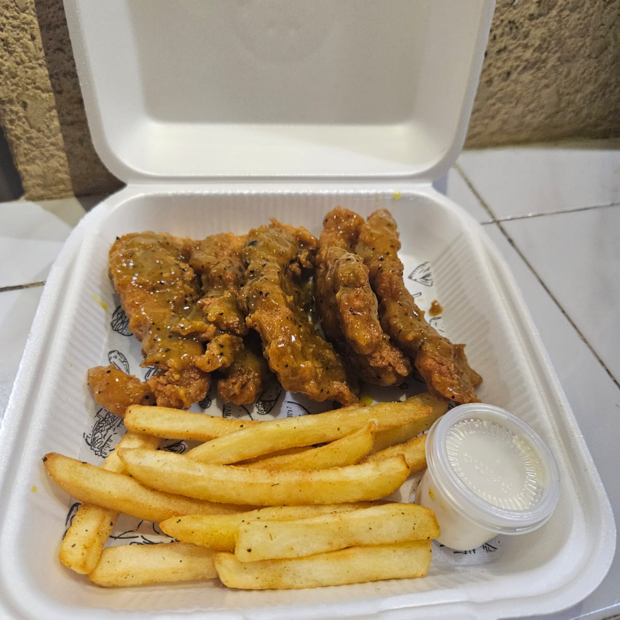 Ricas tiras de pechuga de pollo , marinadas con especias , empanizado y fritas , incluye aderezo ranch y una porción de francesa.