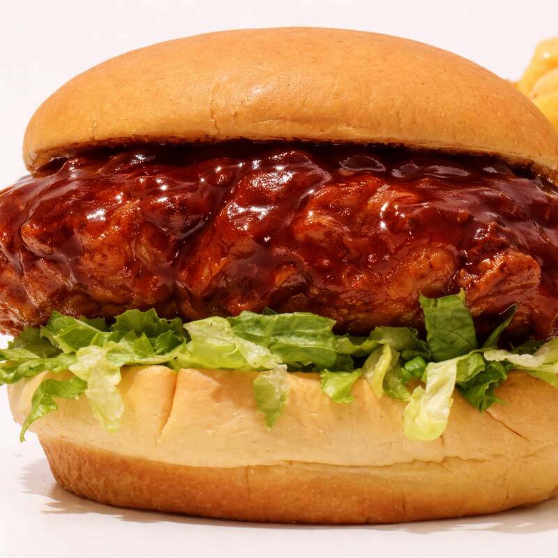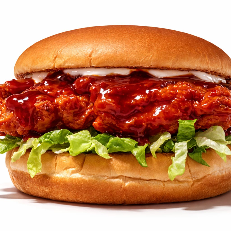 Hamburguesa de tiras de pollo crispy ( 3 a 5 pzs ) marinadas con especias , empanizados y fritas, bañadas en la salsa BBQ , incluye , pan brioche , lechuga romana , jamón cocido, queso , tomate y cebolla , incluye una porción de francesa y un aderezo ranch .