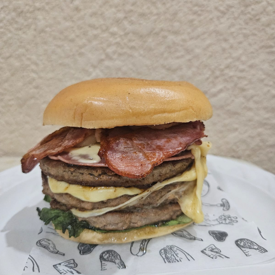 Hamburguesa sencilla con triple carne y queso, con carne de 120gr cada una, con pan bimbollo, romanita, tomate, cebolla y jamón cocido. Incluye aderezos, catsup, mayonesa, mostaza y jalapeño. Incluye porción de papas.