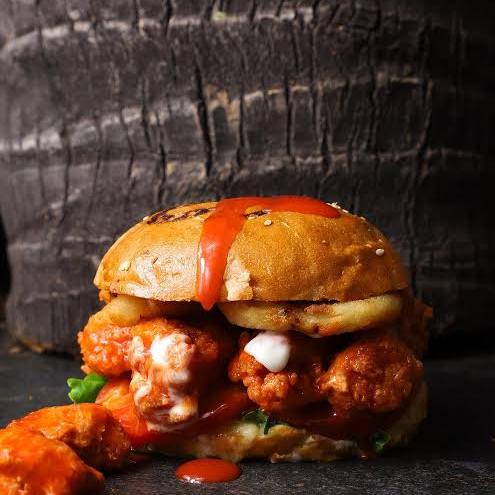 Hamburguesa de tiras de pollo crispy ( 3 a 5 pzs ) marinadas con especias , empanizados y fritas, bañadas en la salsa Búfalo , incluye , pan brioche , lechuga romana , jamón cocido, queso , tomate y cebolla , incluye una porción de francesa y un aderezo ranch .
