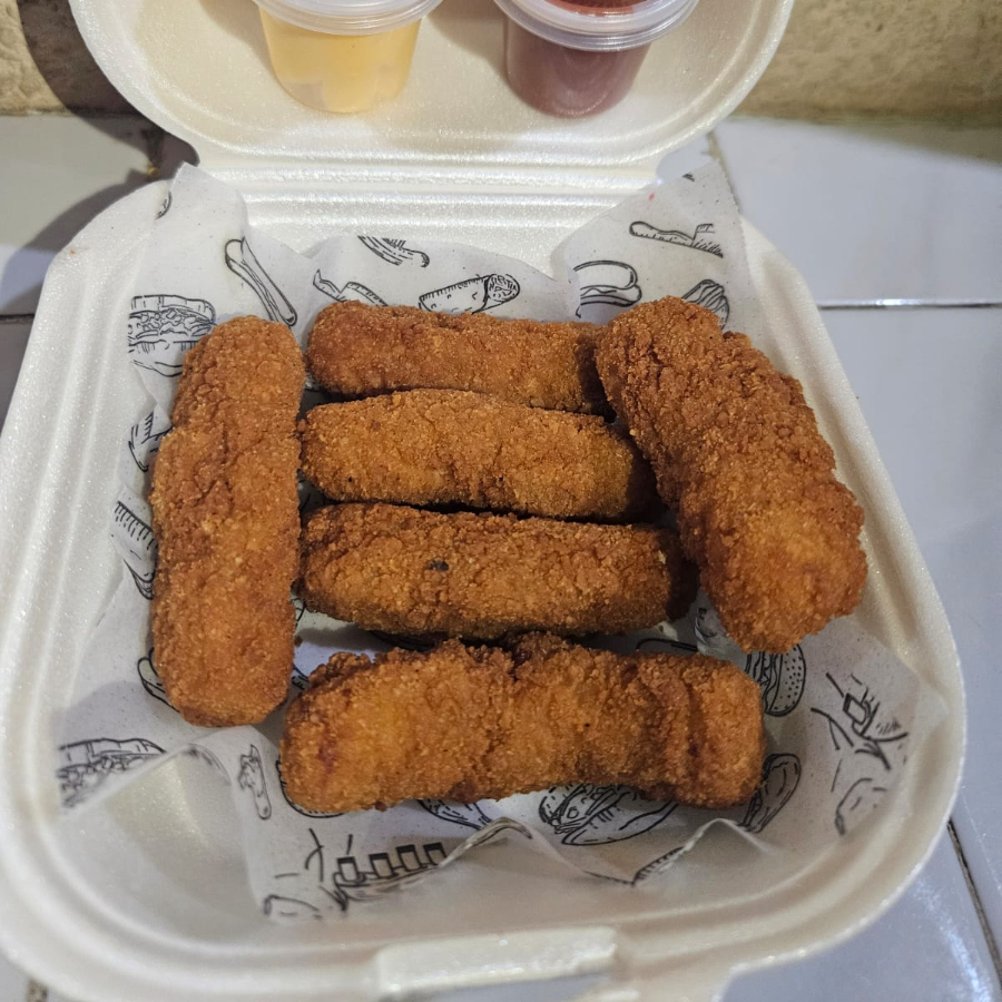 Pechuga de pollo , empanizadas con especias y fritas , incluye catsup, salsa picante y queso cheddar