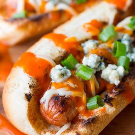 Dogo de salchicha de pavo jumbo ( 18 cm ) con salsa BÚFALO queso manchego , pan de dogo con ajonjolí ( 18 cm ) , incluye cebolla cocida , aderezos , mayonesa , mostaza , jalapeño , catsup y una porción de papa francesa SÓLO INCLUYE UNA PORCIÓN DE FRANCESA