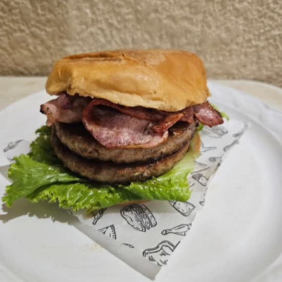 Hamburguesa tocino con triple queso y carne de 120gr cada una, con pan bimbollo ,romanita, tomate, cebolla y jamón cocido. Incluye aderezos, catsup, mayonesa, mostaza y jalapeño. Incluye porción de papas.