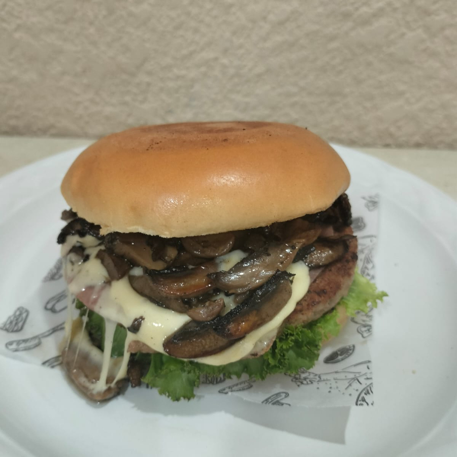 Hamburguesa champiñon con triple queso y carne de 120gr cada una, con pan bimbollo, romanita, tomate, cebolla y jamón cocido. Incluye aderezos, catsup, mayonesa, mostaza y jalapeño. Incluye porción de papas.