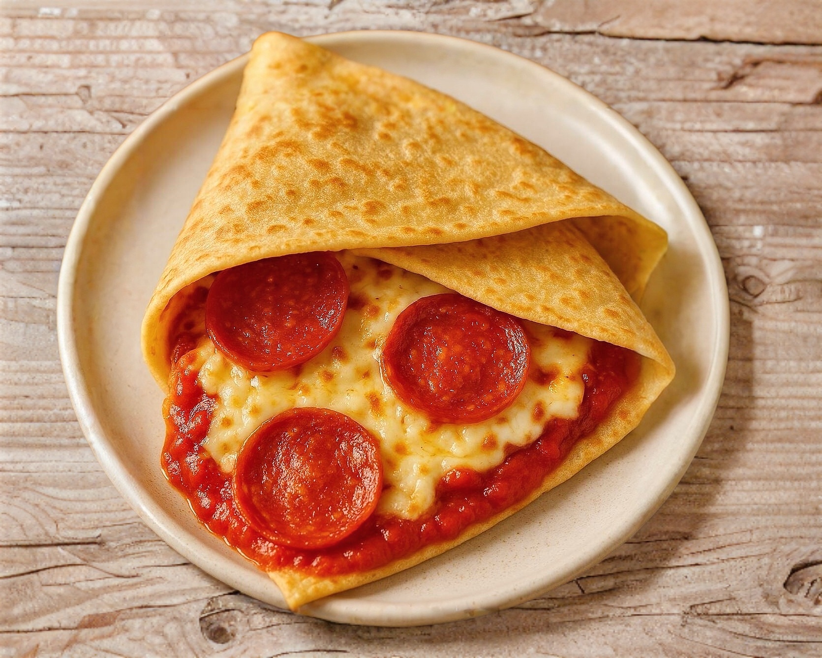 Deliciosa crepapizza con base de crepa, salsa de pizza, pepperoni y queso derretido.