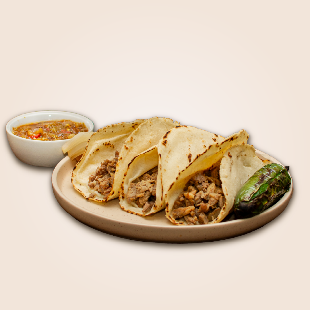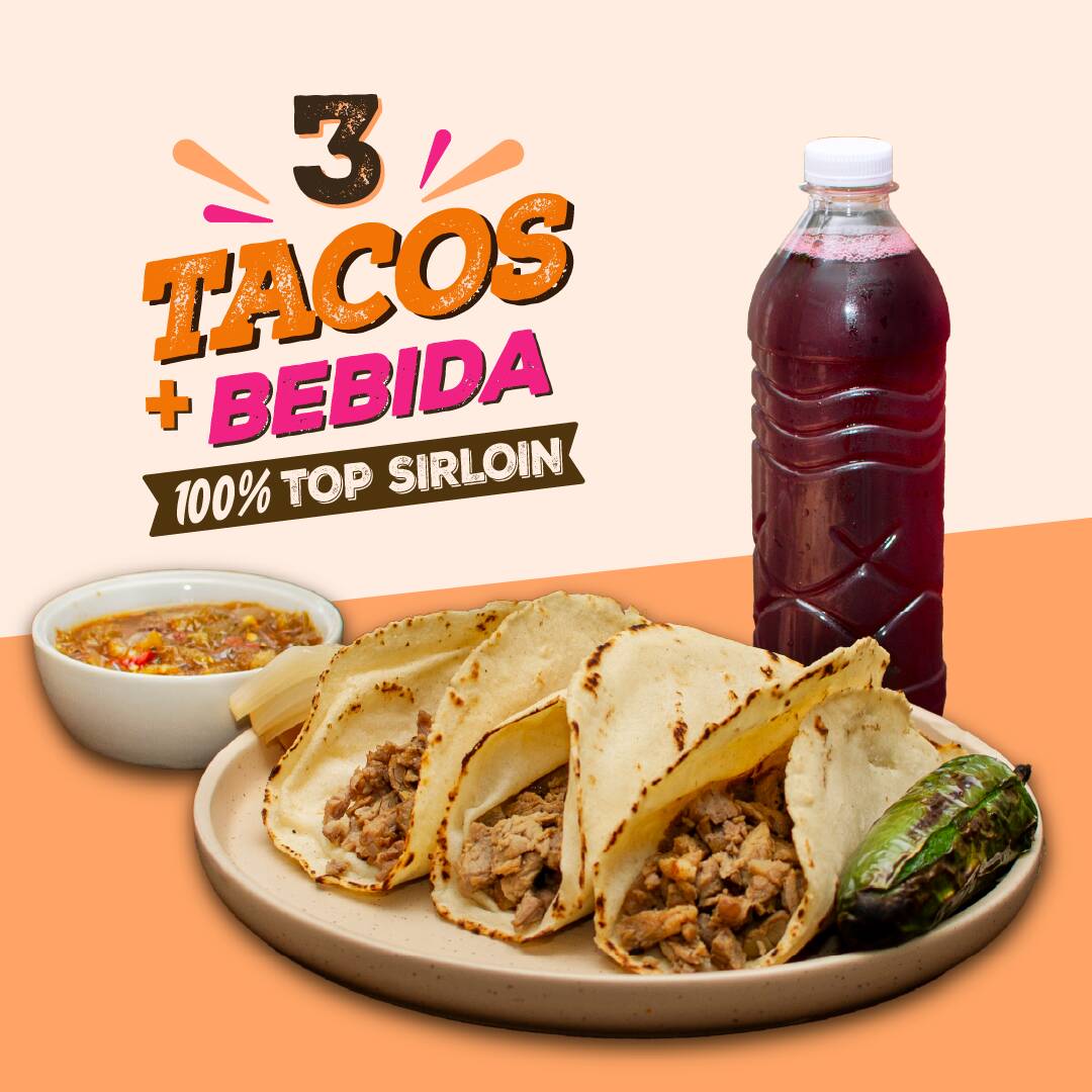 3 Tacos de carne asada al carbón top sirloin + bebida