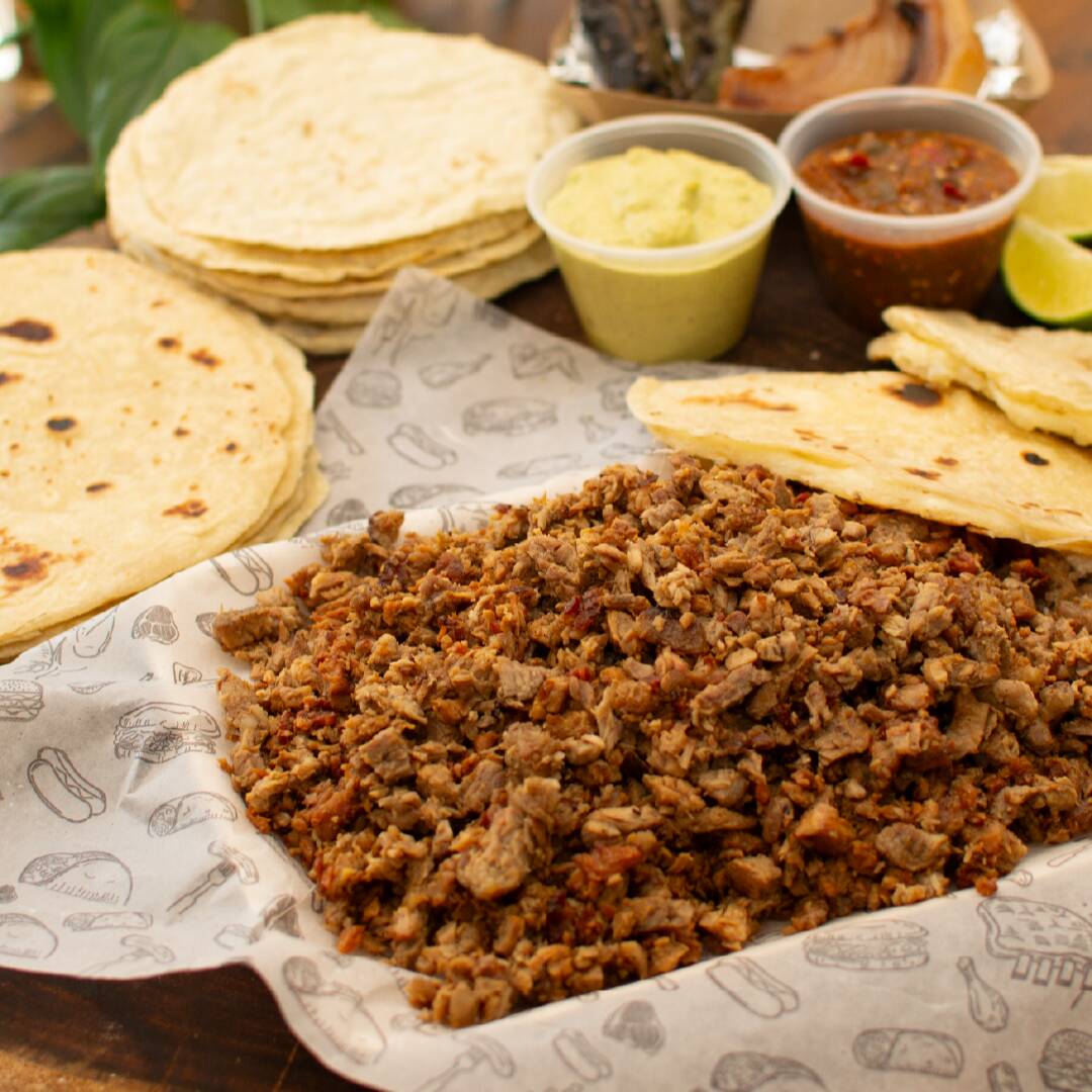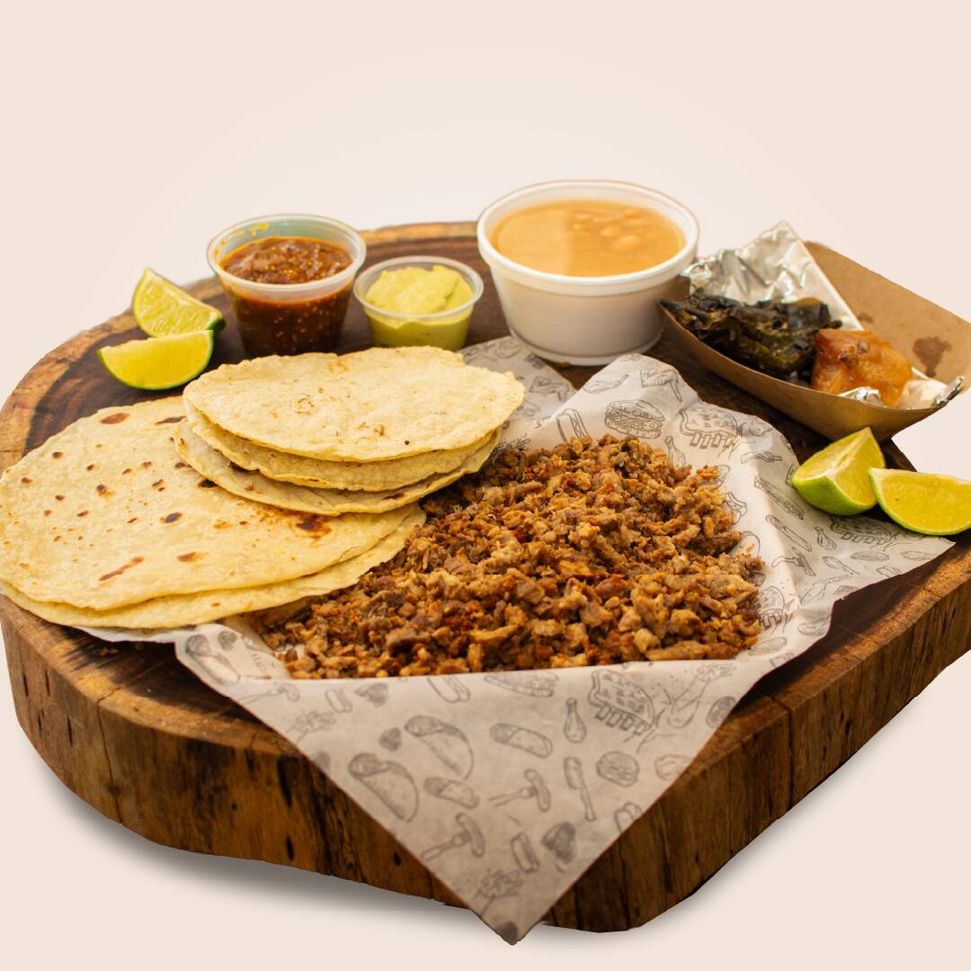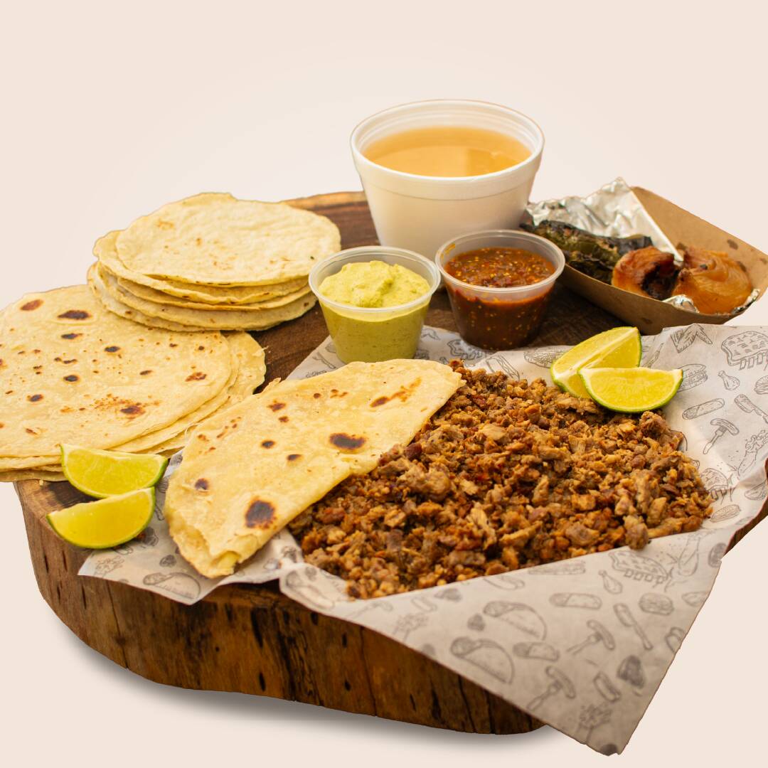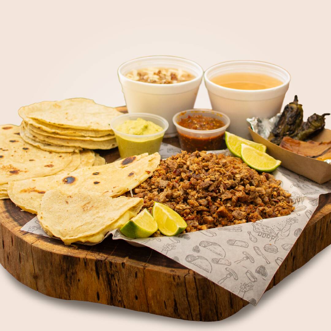 1/2 Orden de top sirloin importado asado al carbón al estilo norteño, incluye: tortillas de harina y maíz hechas a mano, 1 quesadilla, 1/2 litro frijol natural, refresco de 1.75 L, salsa tatemada, cebollita asada y chiles toreados