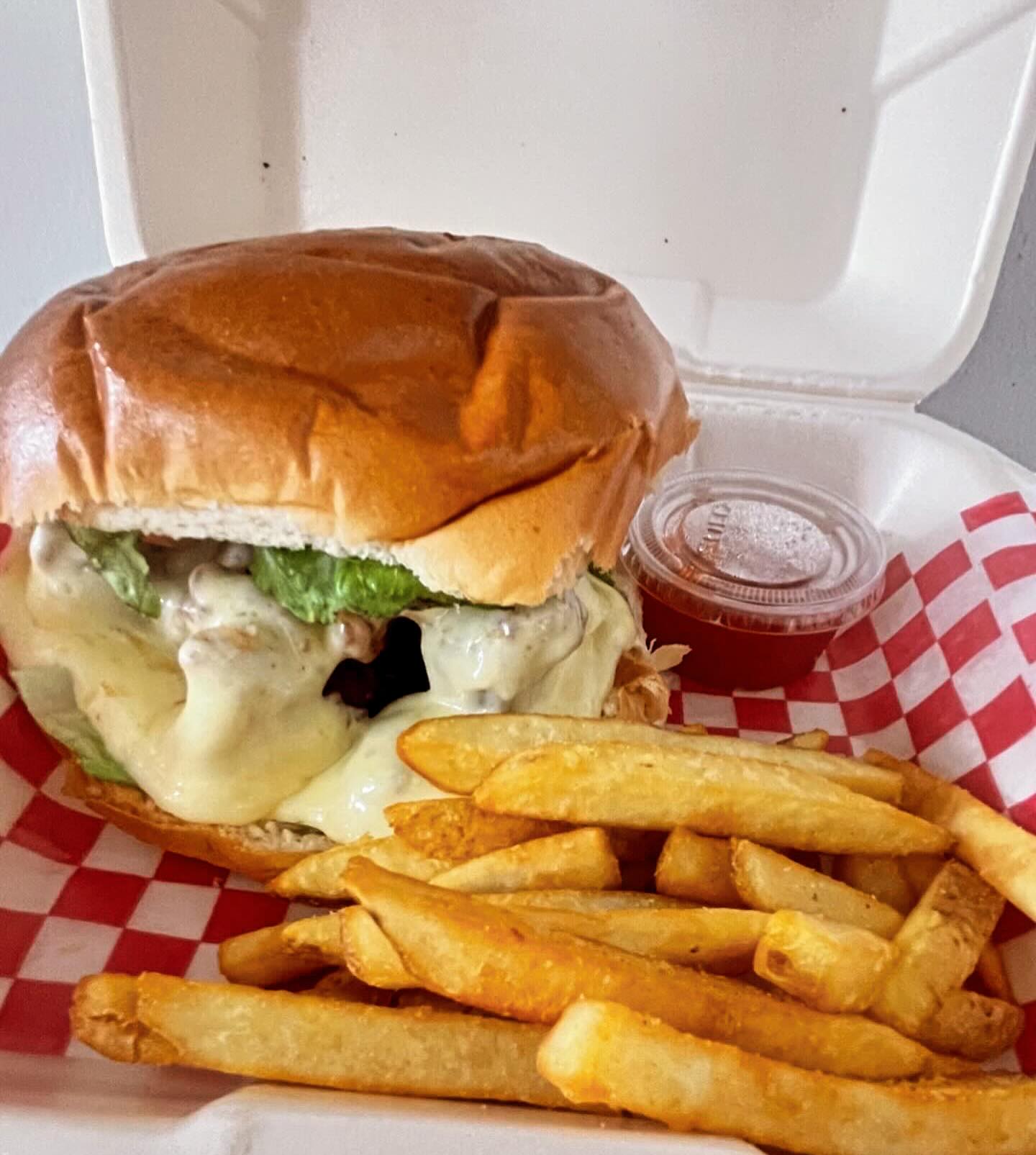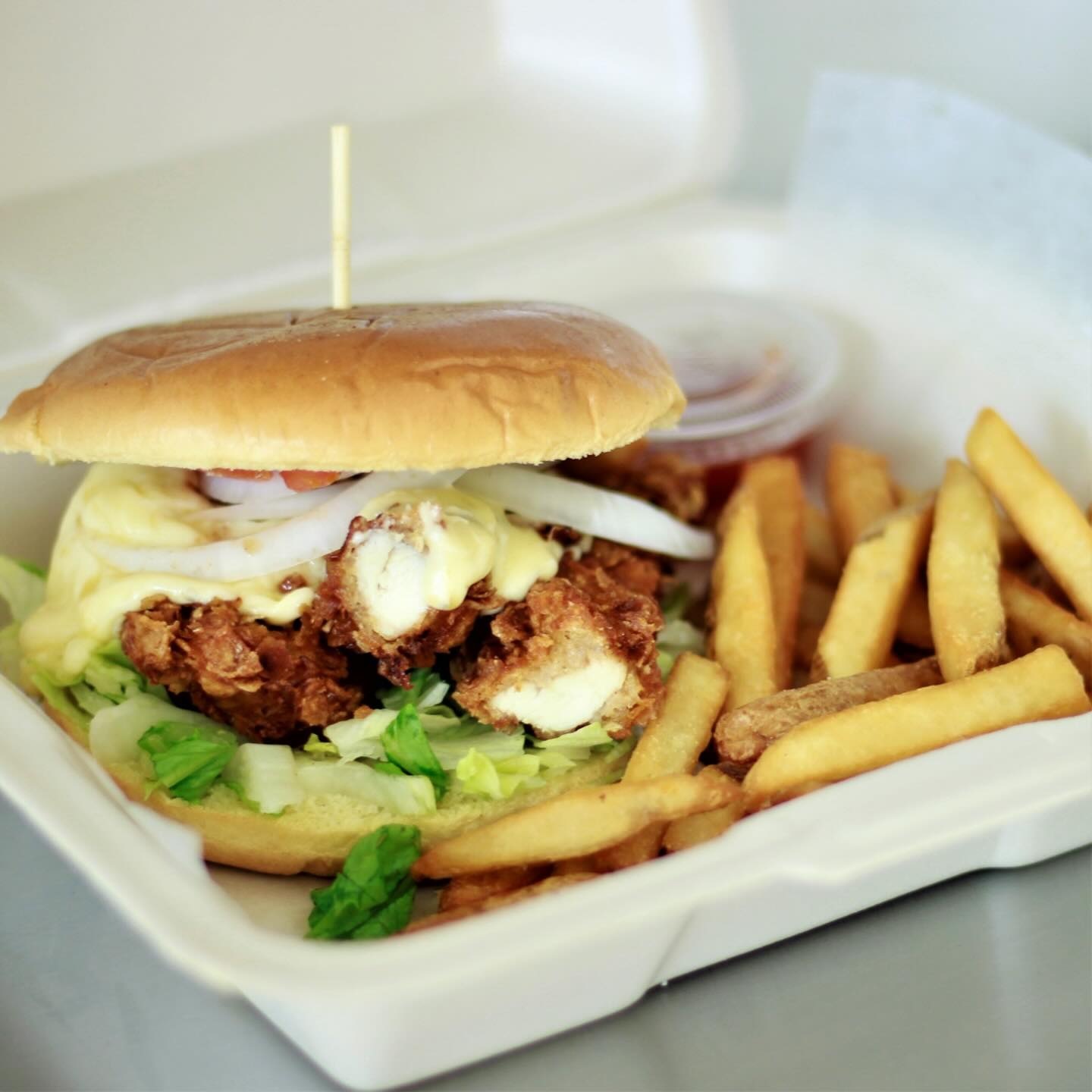 Acompañada de ranch, papas a la francesa y catsup.