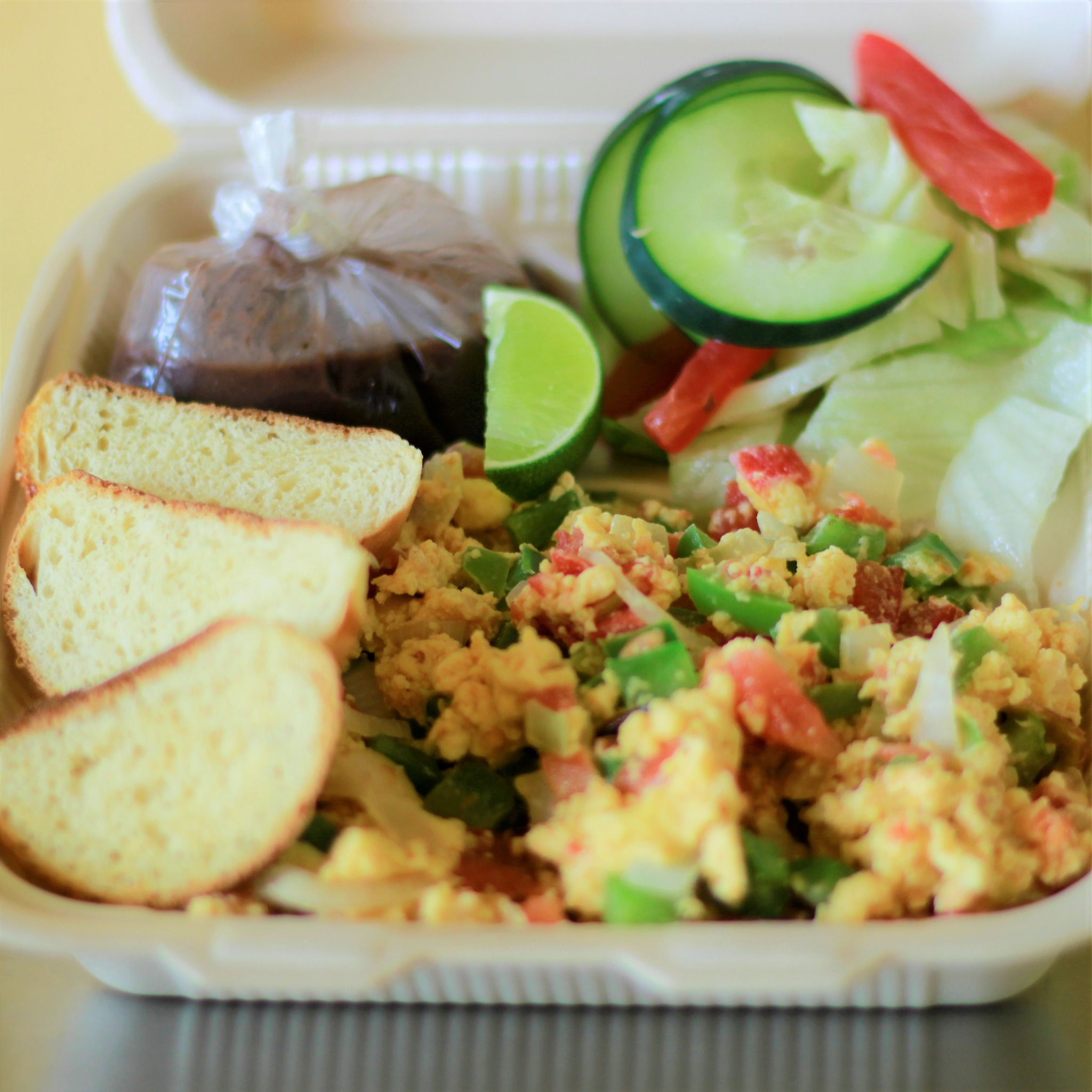 Huevos revueltos con tomate, pimiento y cebolla, acompañados de salsa, panecitos y frijol colado.
