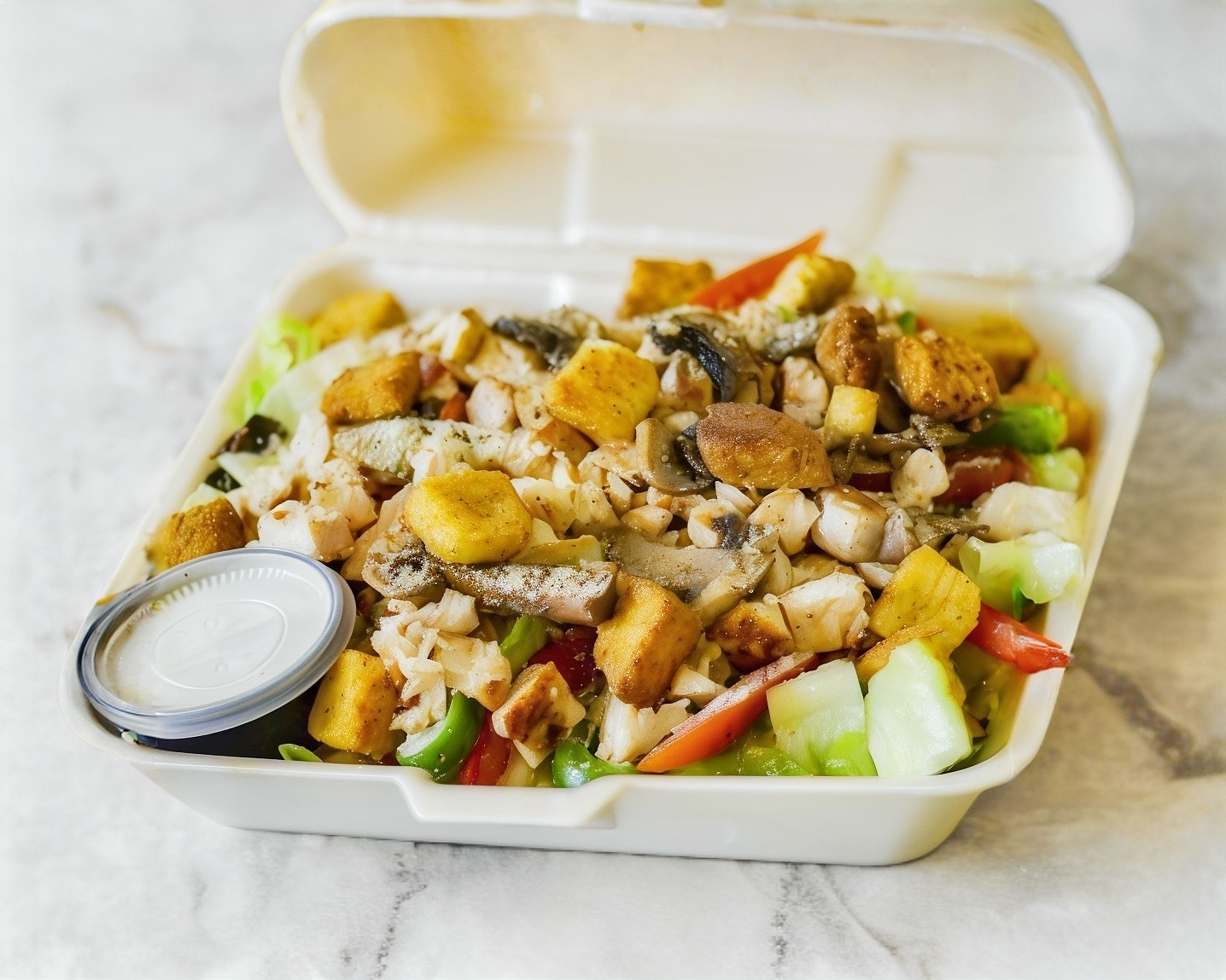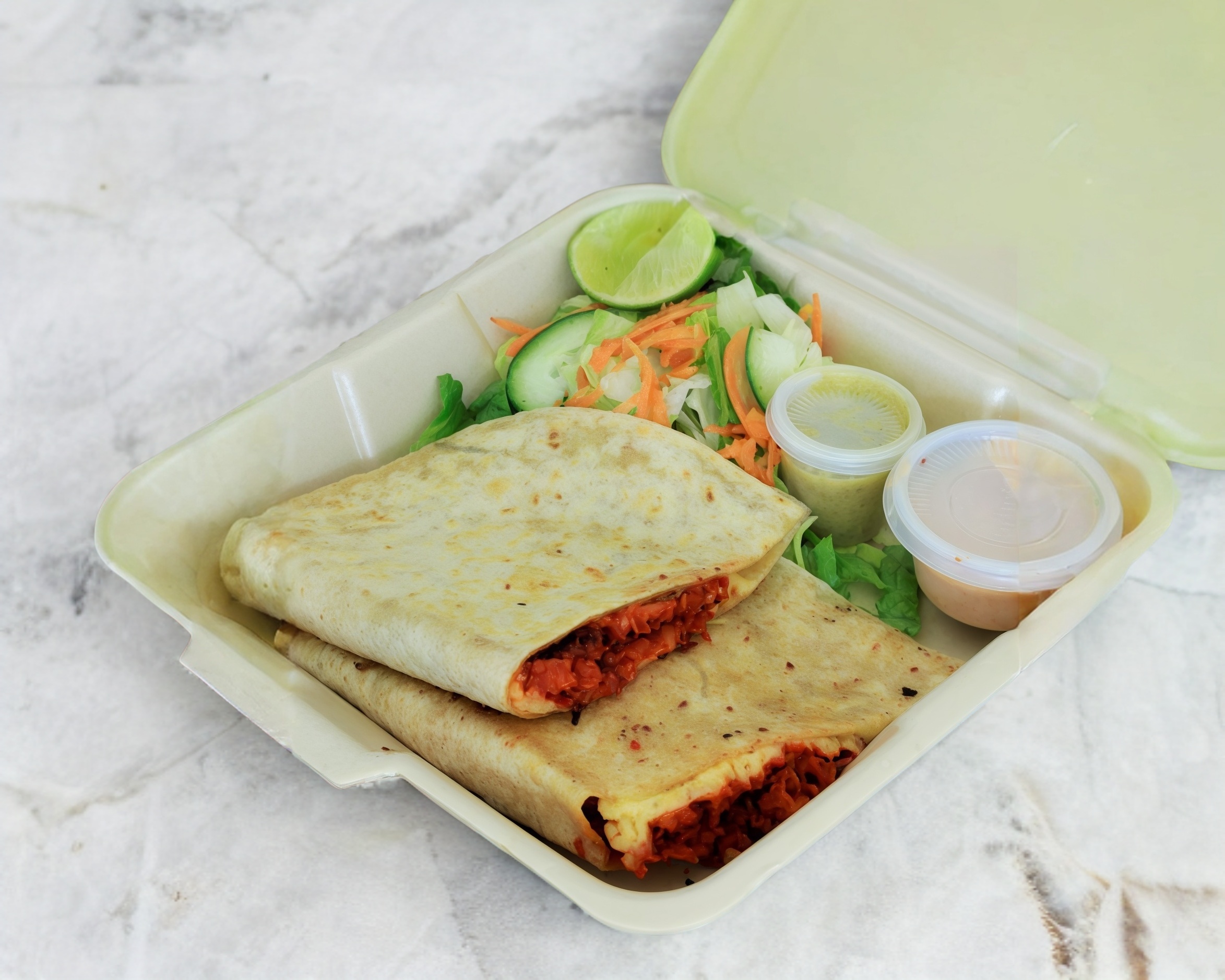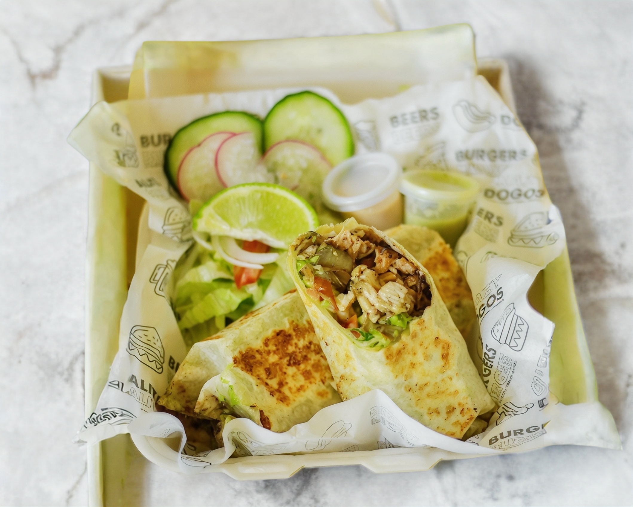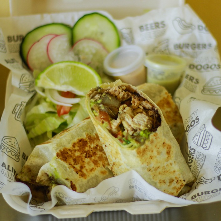 Tortillon, frijol, pechuga a la plancha, cebolla asada y queso, de ensalada y aderezo chipotle. Incluyen papas Hawaiano y mexicana.