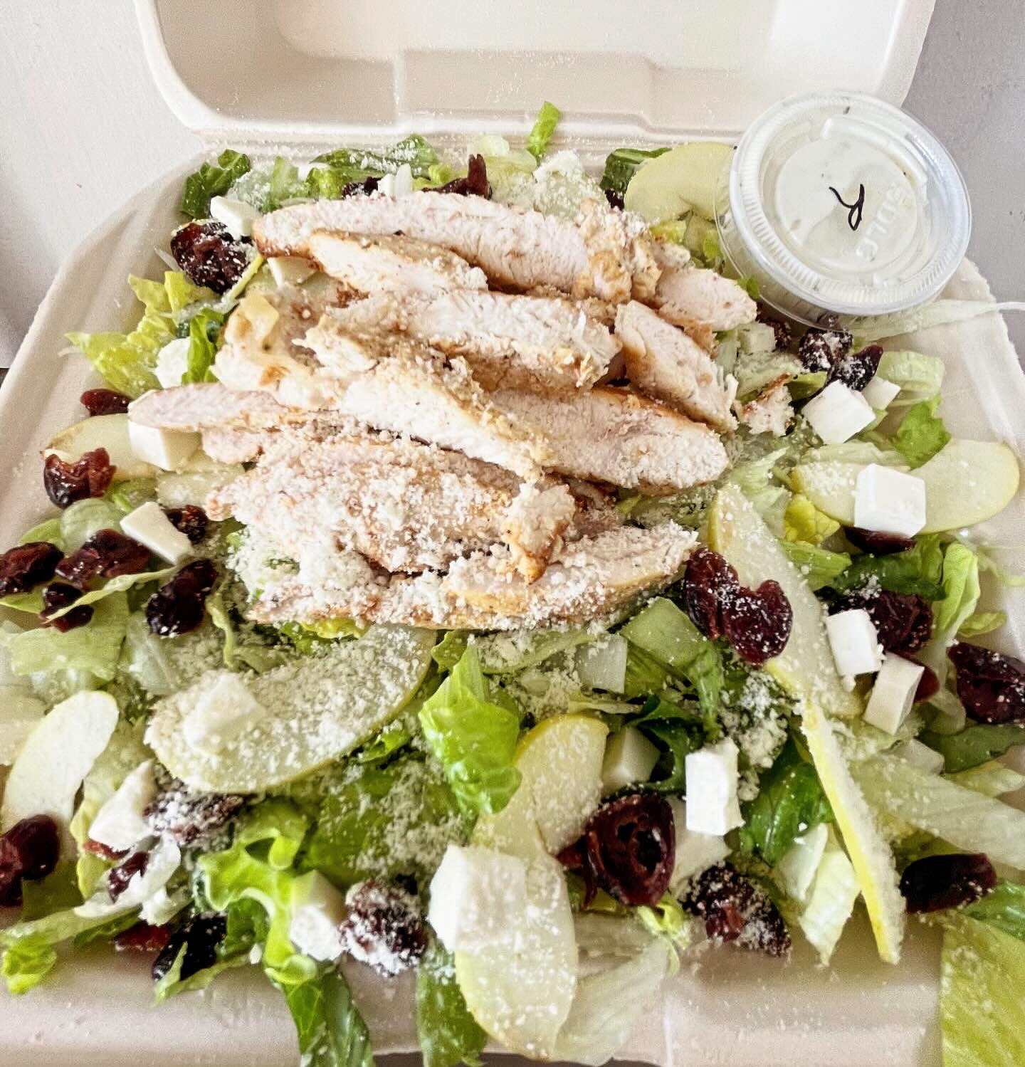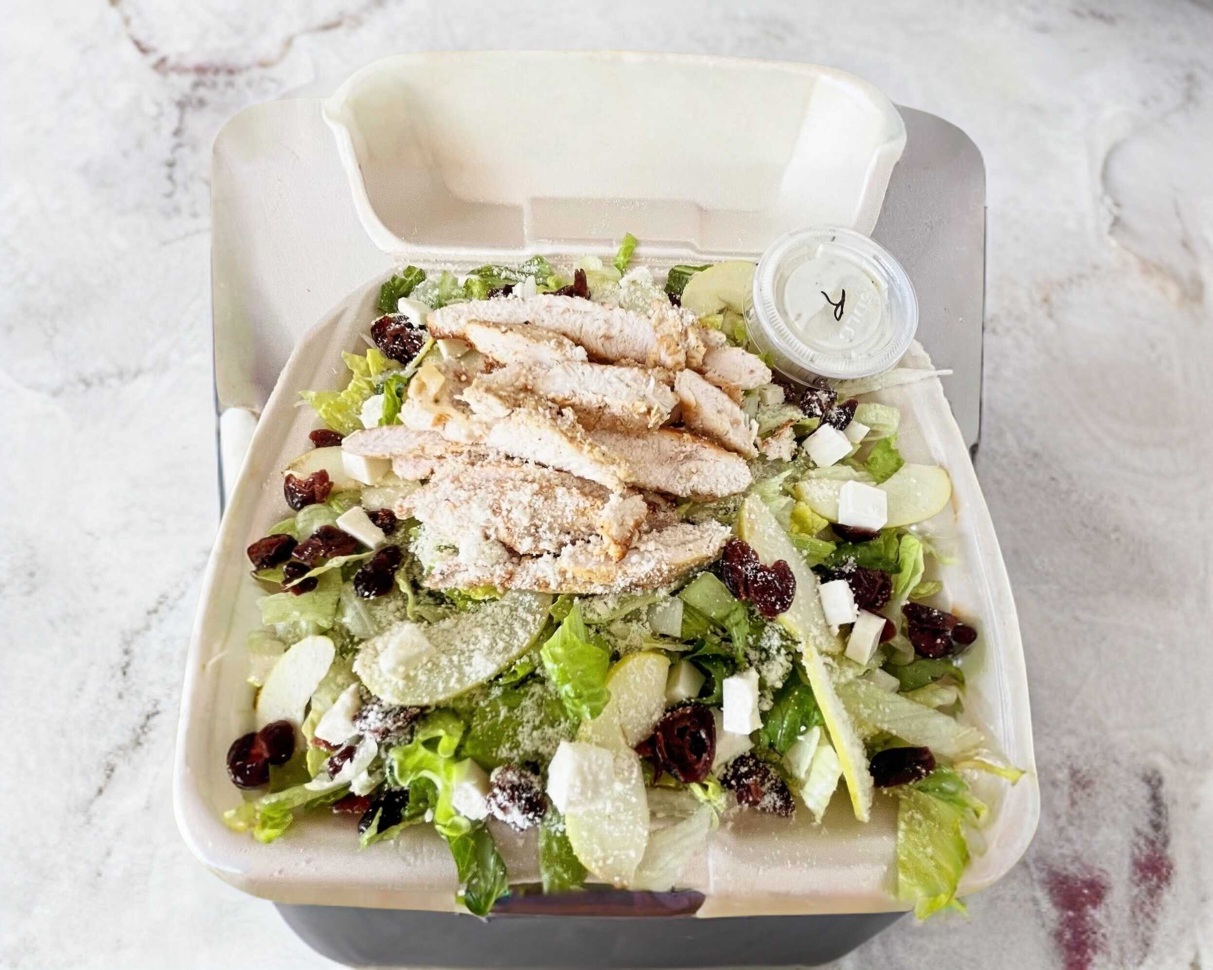 Lechuga mixta, manzana amarilla, queso crema, arándanos deshidratados, trocitos de pechuga a la plancha y queso parmesano.