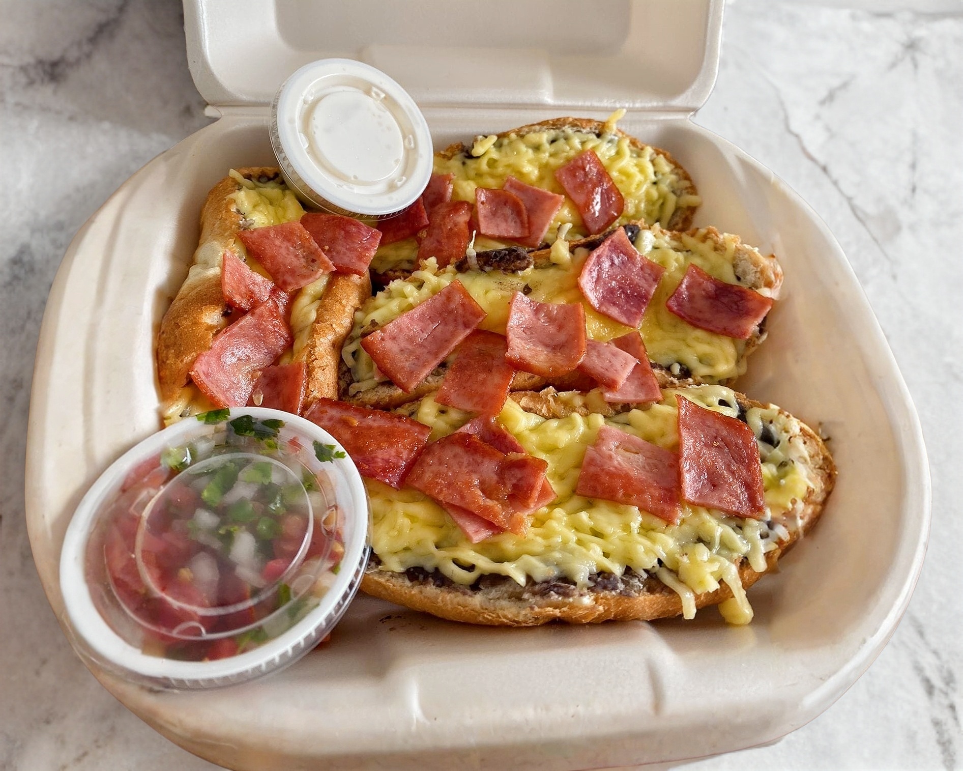 Molletes con Tocino (4), servidos con pico de gallo, acompañada de crema.