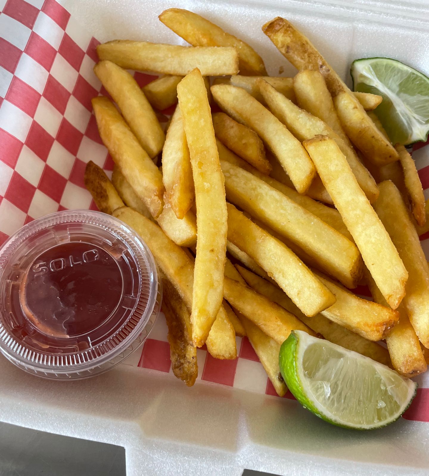 Tiras crispy chipotle, mas papas a la francesa y cátsup.