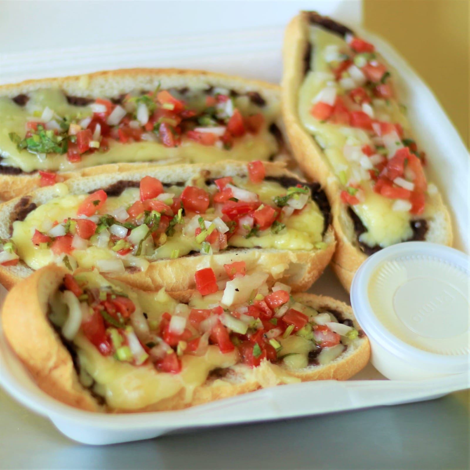 Molletes (4), servidos con pico de gallo, acompañada de crema.