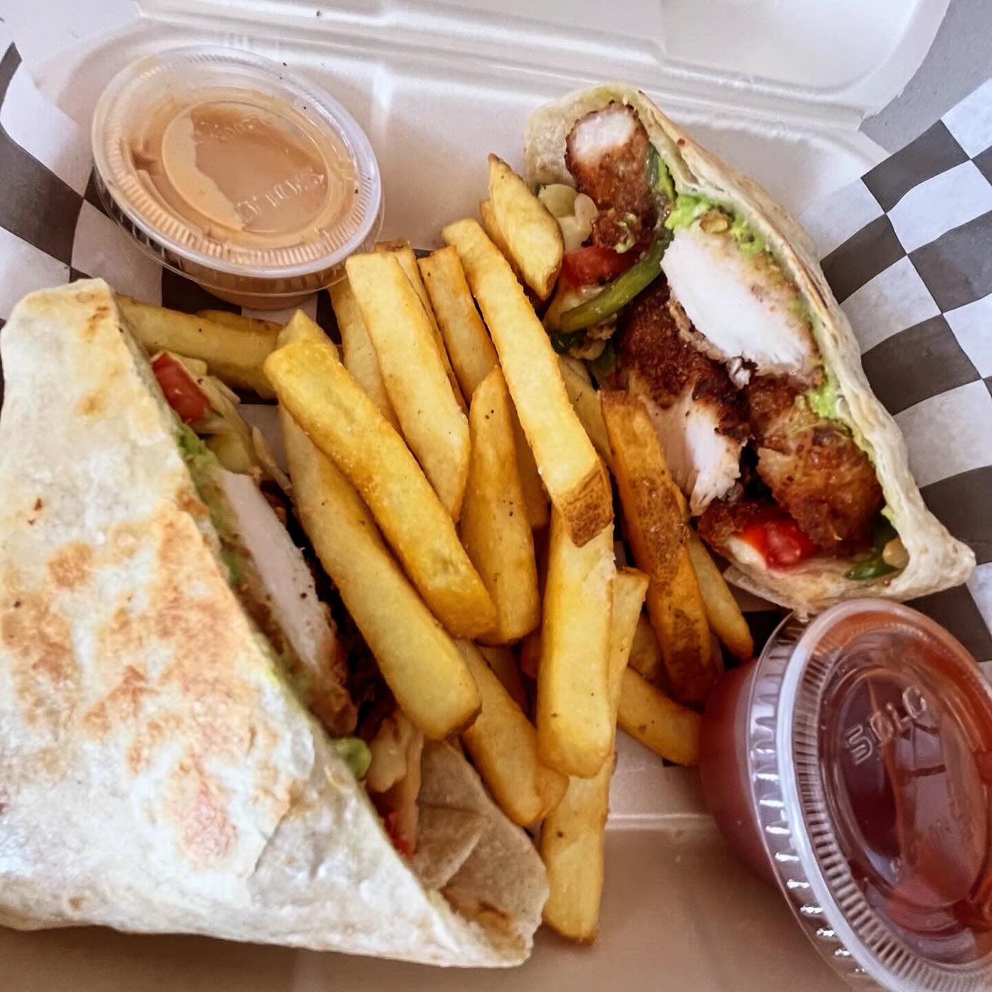 Tortillon, tiras de pollo, guacamole, queso, pimiento y cebolla, A, de papas a la francesa, cátsup y chipotle.