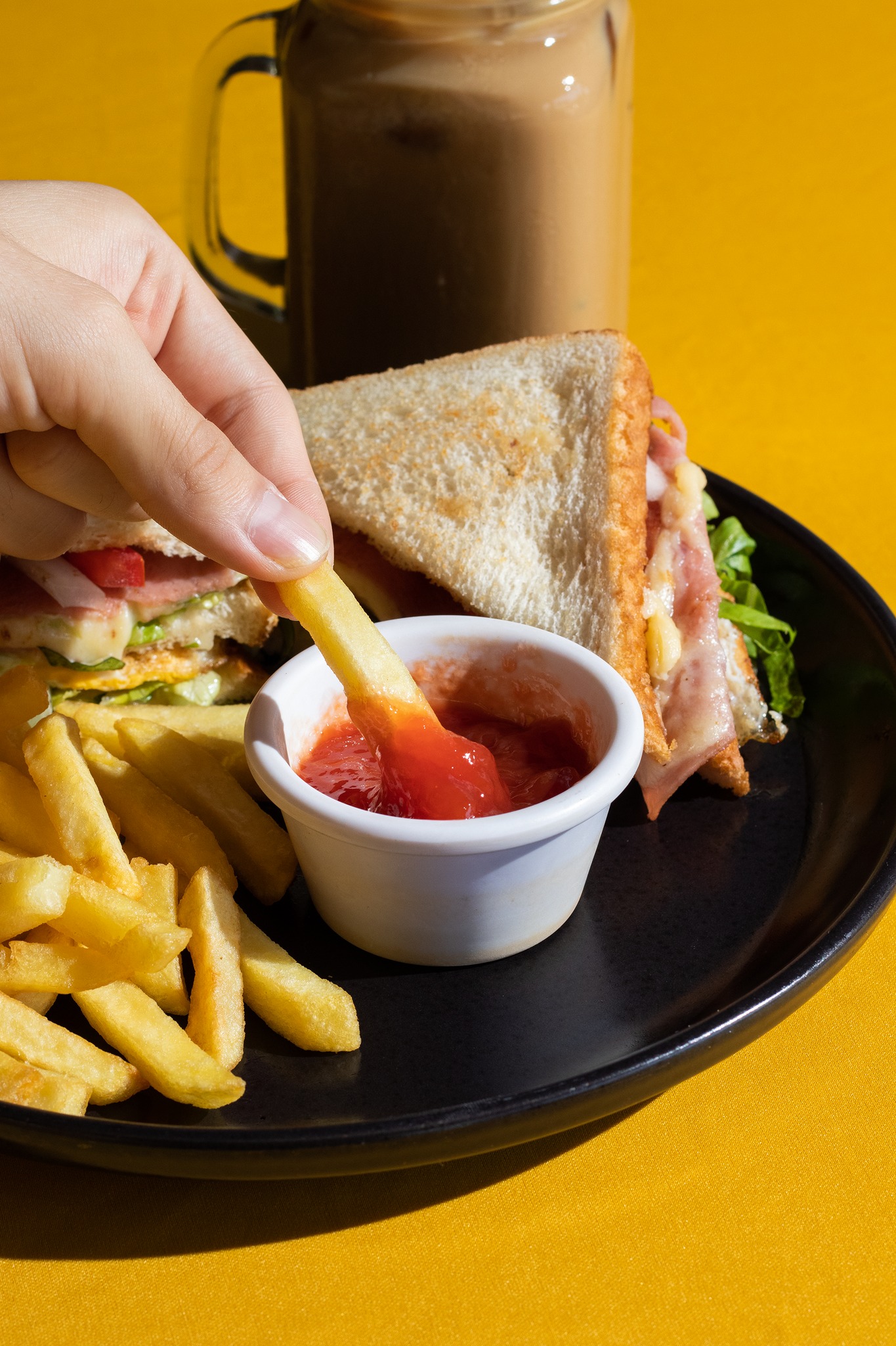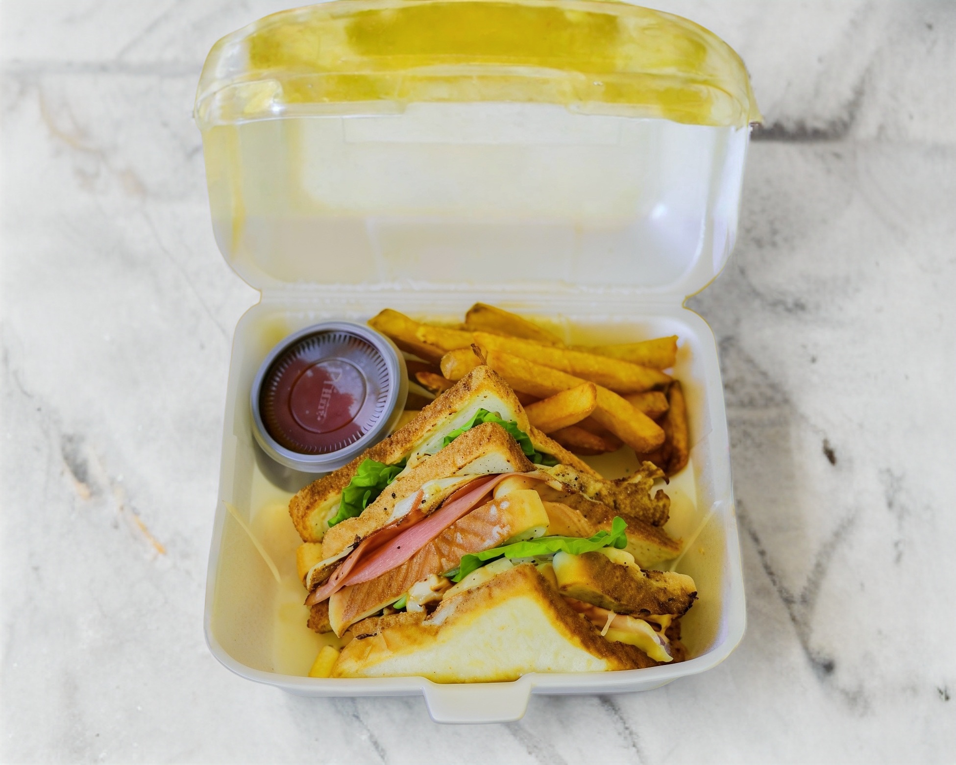 Jamón, queso, con papas a la francesa y Catsup.