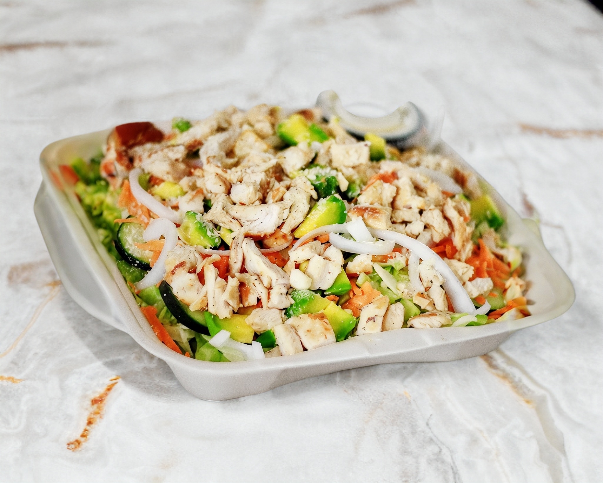 Lechuga mixta, rodajas de pepino, zanahoria rayada, cebolla en juliana, queso parmesano, trocitos de aguacate y pechuga a la plancha.