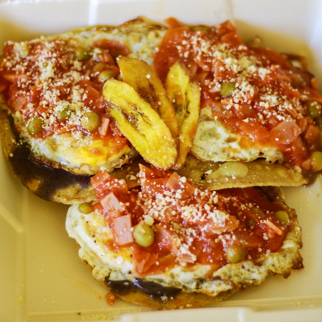 3 Pzs, tostadas, frijol, un huevo estrellado, salsa con trocitos de jamón, chicharos y plátano frito.