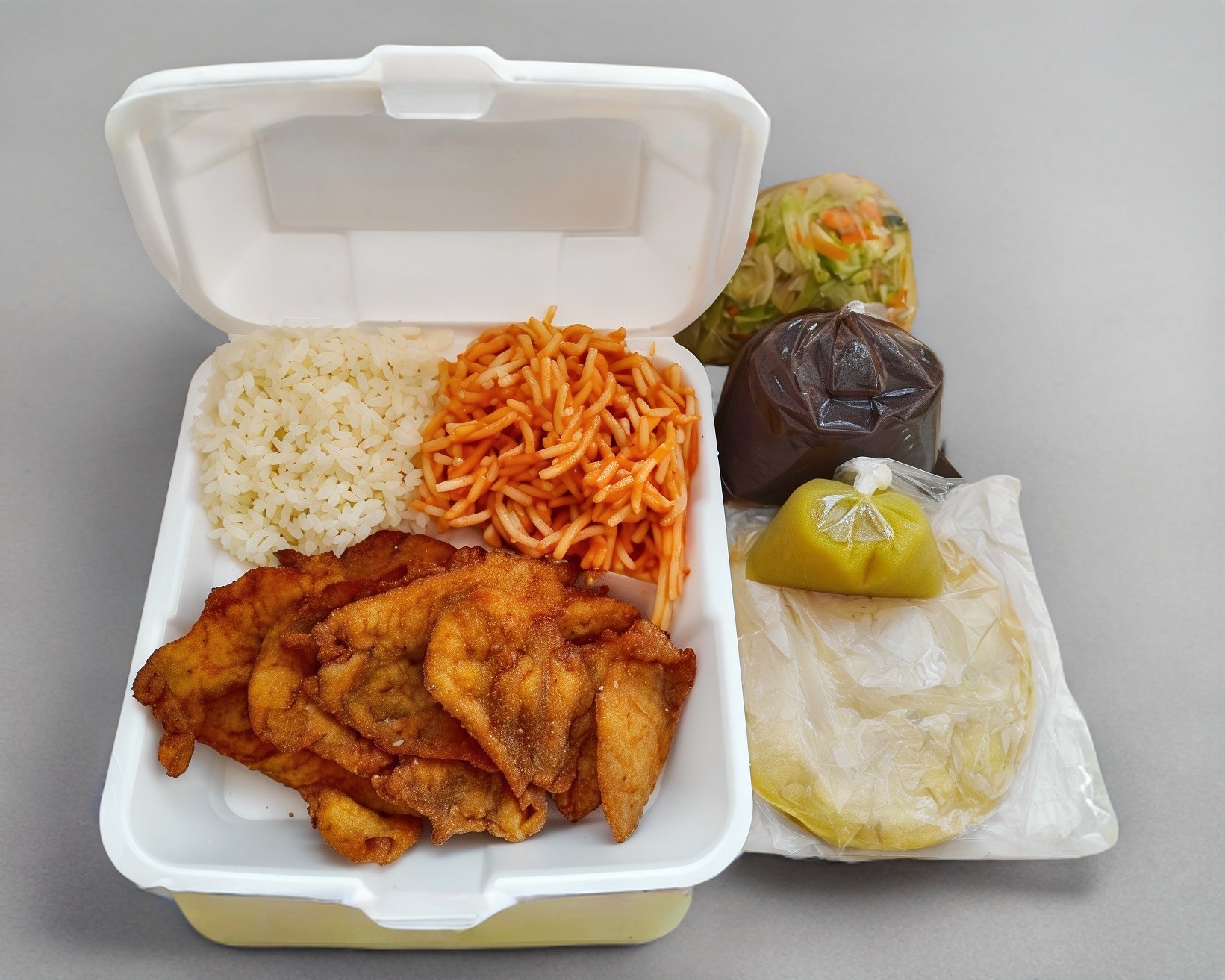 Acompañada de espagueti, arroz, frijol, ensalada, tortilla y picante.