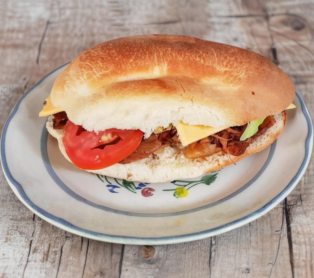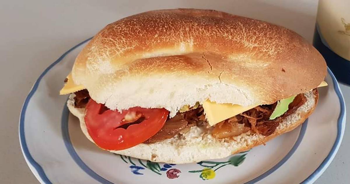 Milanesa de pollo empanizada, tomate,cebolla bañado en frijol y mayonesa