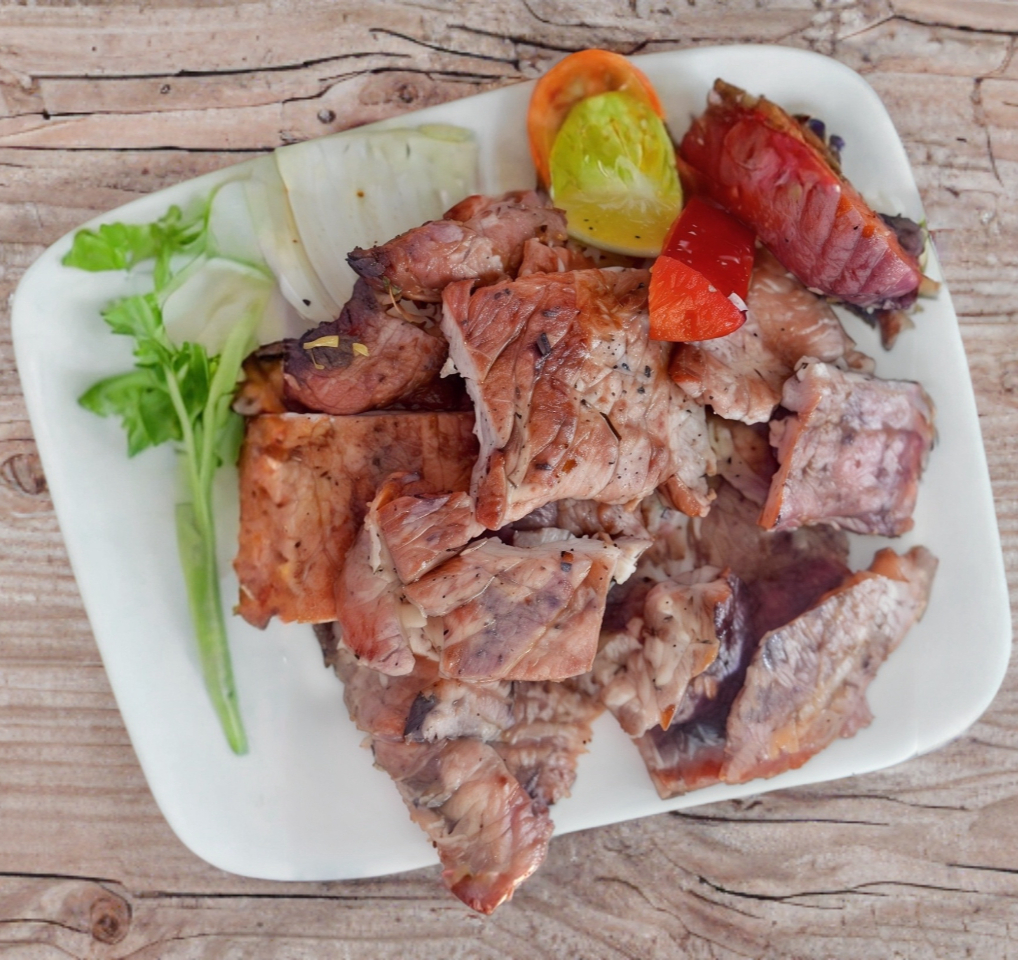 Deliciosa milanesa de cerdo marinada con el toque de la casa, con verduras incluyendo, tomate repollo limón chile, salsa de tomate echo de la casa