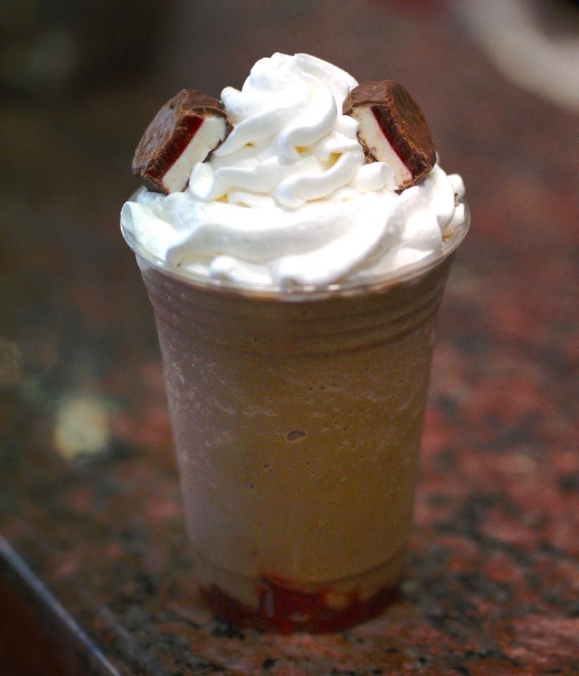 Bebida frappeada sabor mamut hecha a base de leche y base para helado acompañado de crema batida y chispas de chocolate