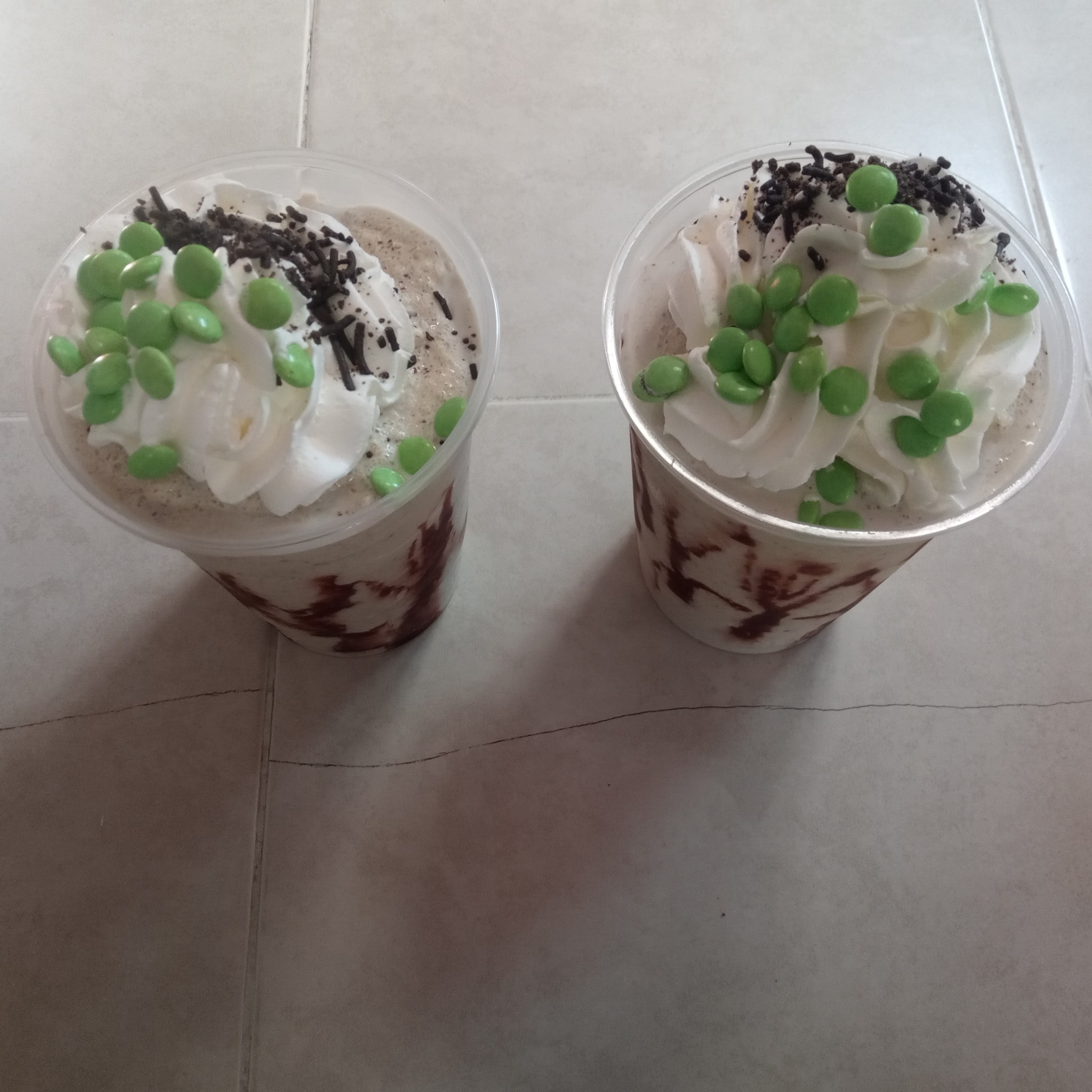 Bebida frappeada sabor chocolatines, hecho a base de leche y base de helado acompañado de crema batida y chispas de chocolate