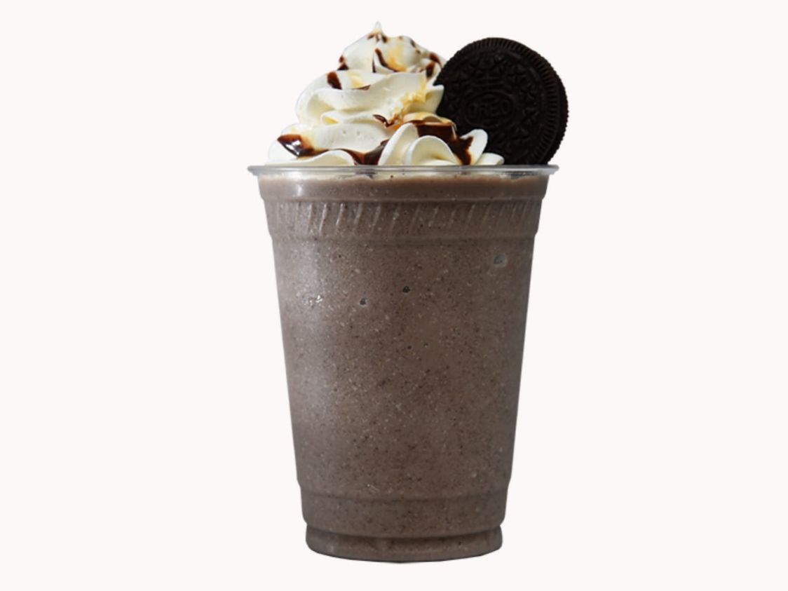 Bebida frappeada sabor chocoretas, hecha a base de leche y base para helado acompañado de crema batida y chispas de chocolate