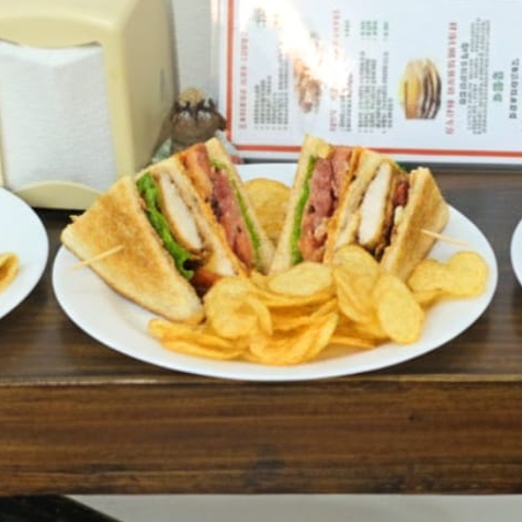 4 Pz de pan de molde , aderezos de mayonesa , jamon de pavo , queso manchego , huevo , lechuga , tomate , acompañado de papas chips ( 25gr)