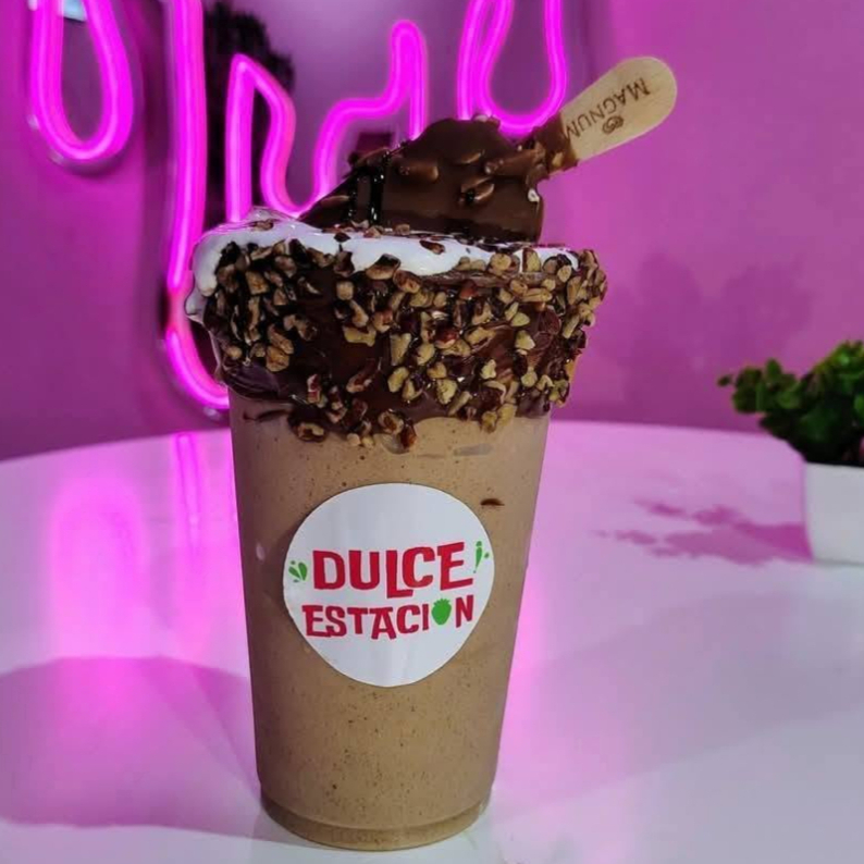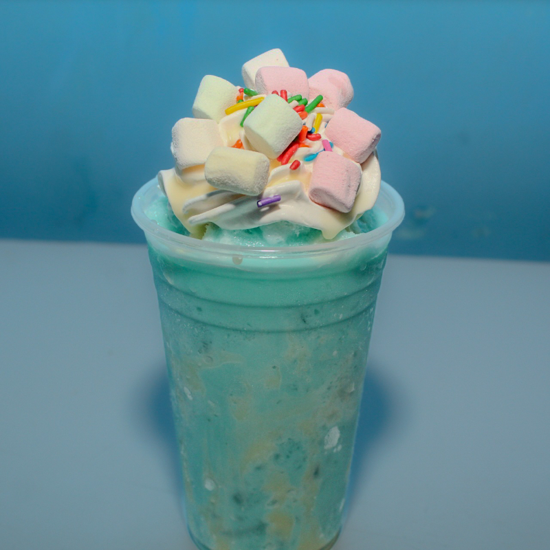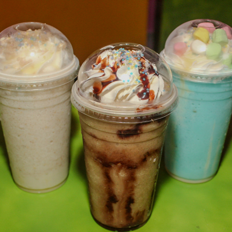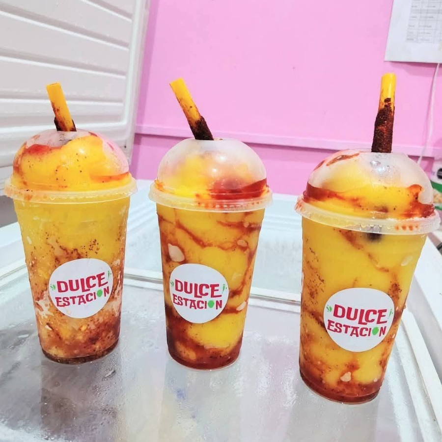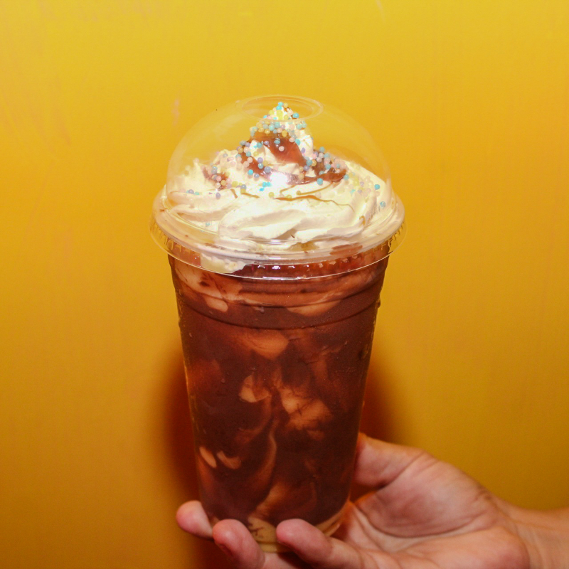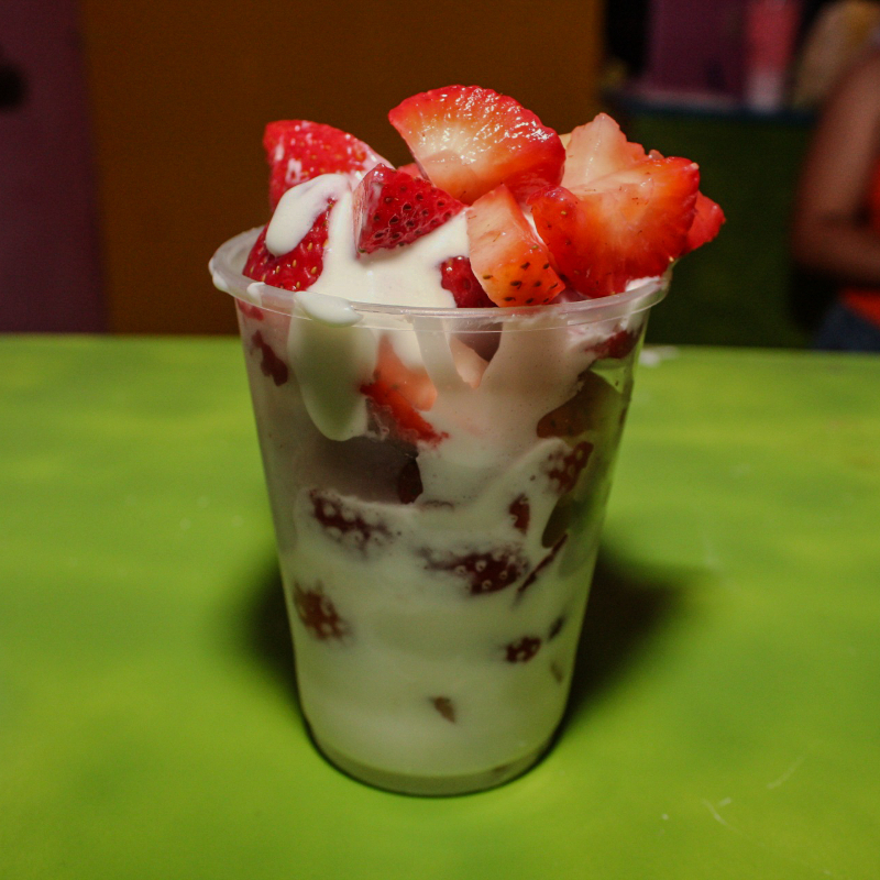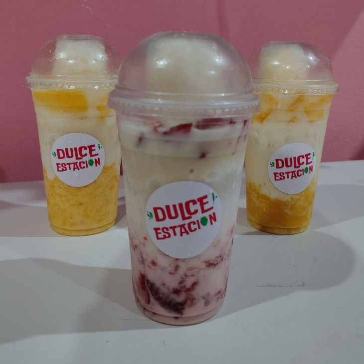 Vaso de 16 oz con hielo triturado y capas de fruta machacada con un toque de lechera y horchata