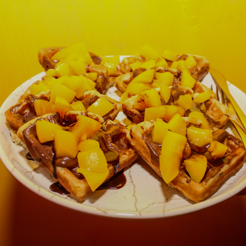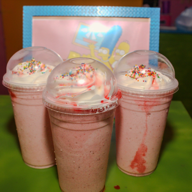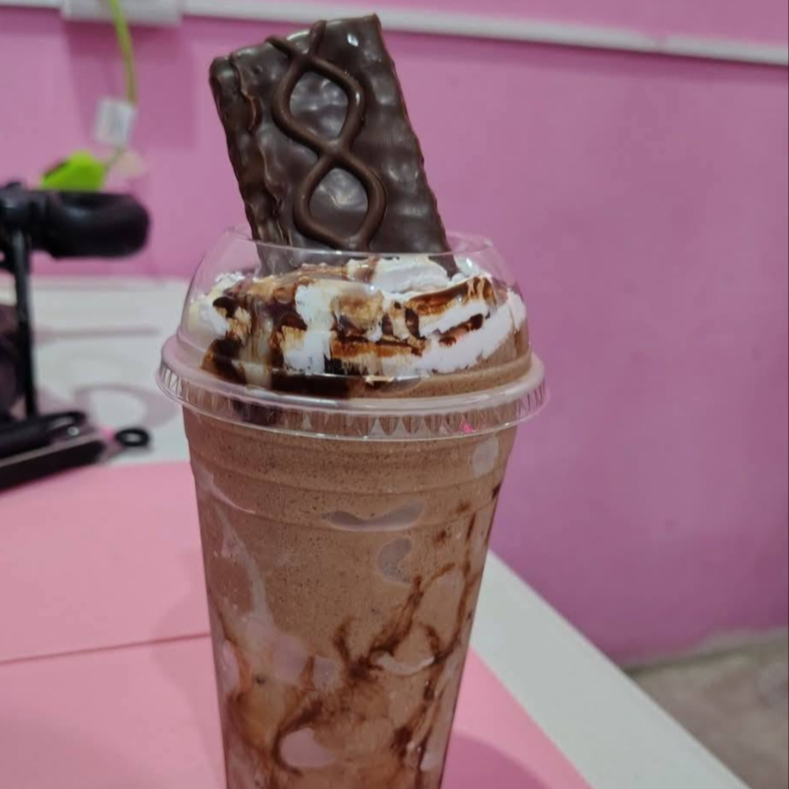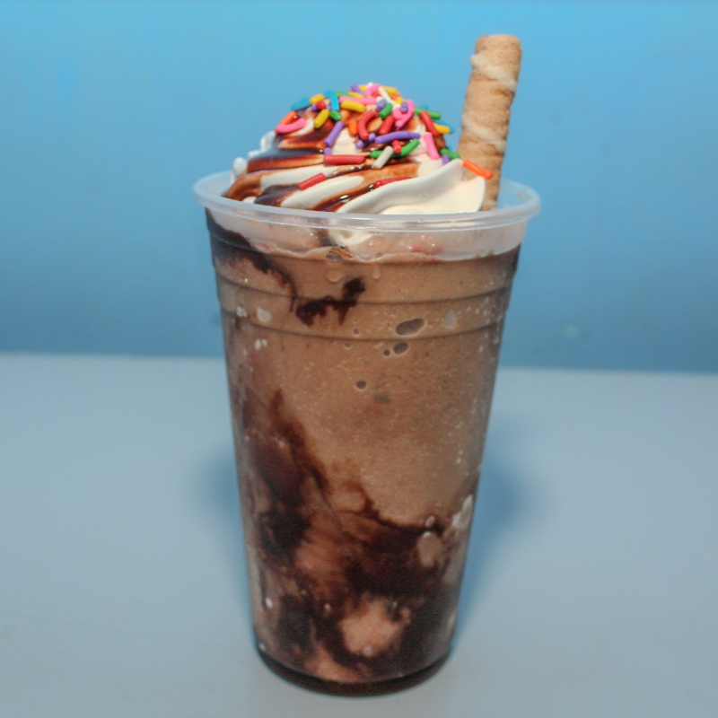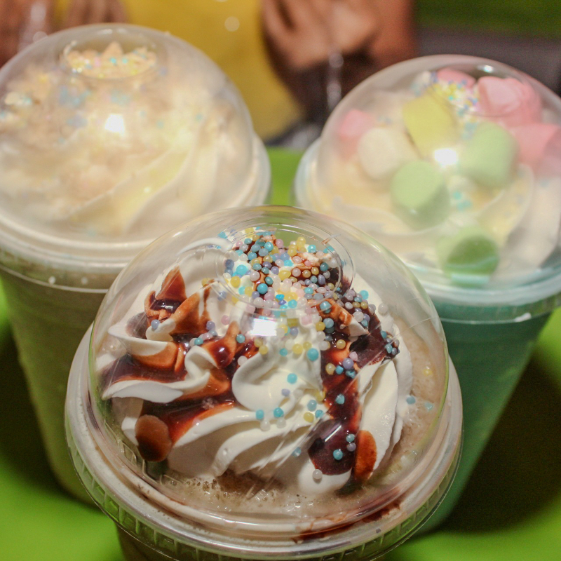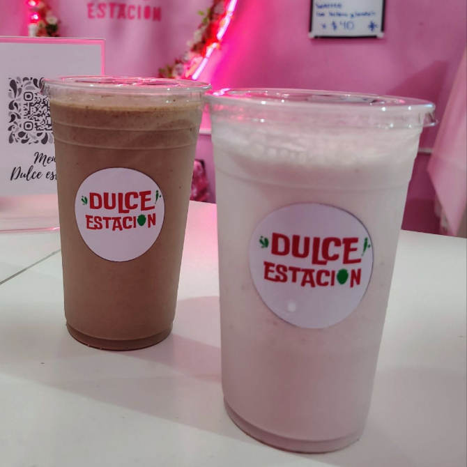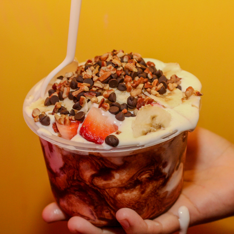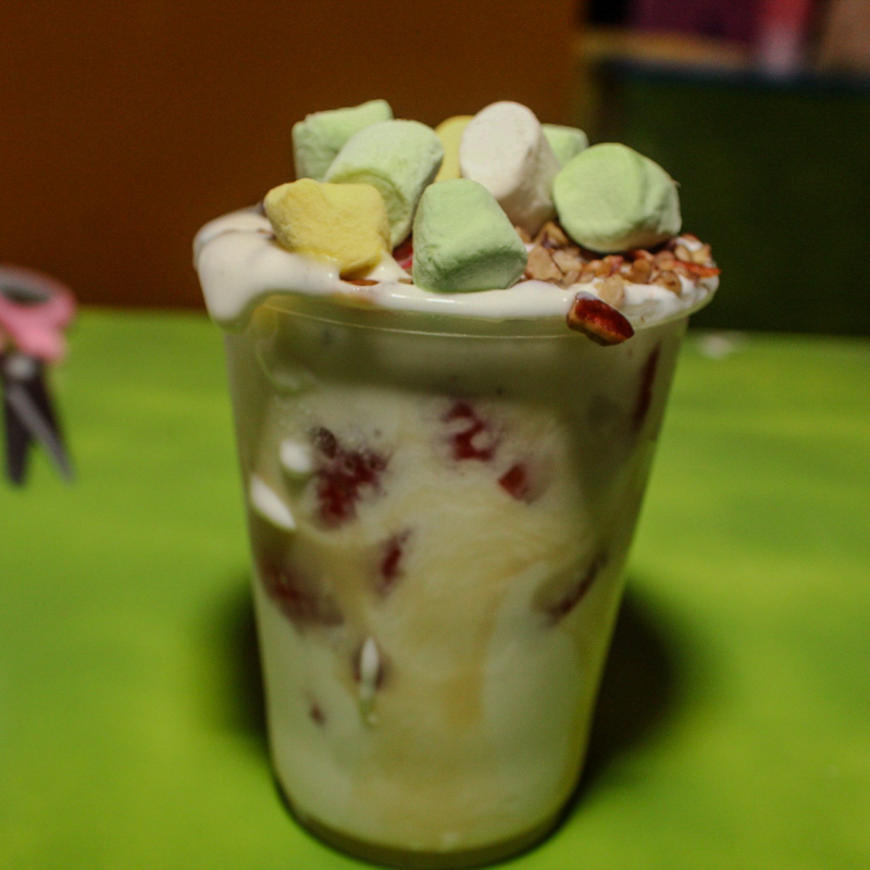 Vaso de 16 oz con hielo triturado y capas de fruta machacada con un toque de lechera y horchata