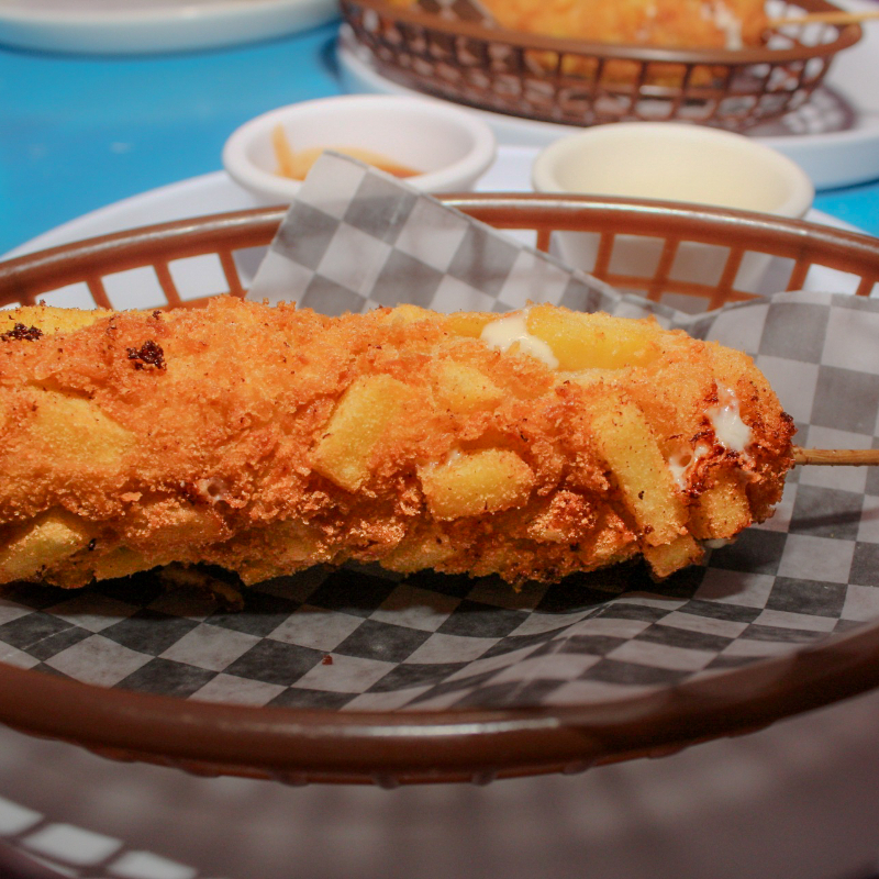 Banderilla rellena de salcchicha y queso cubierta de papas
