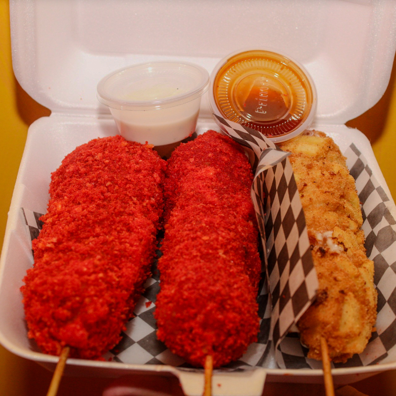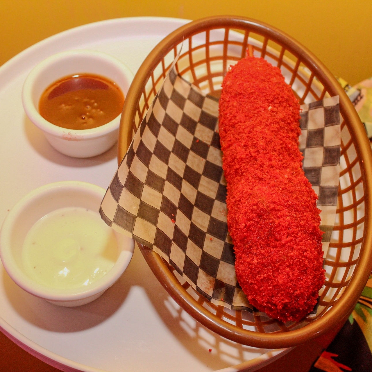 BD coreana rellena de salchicha y queso cubierta con chetos flemmin
