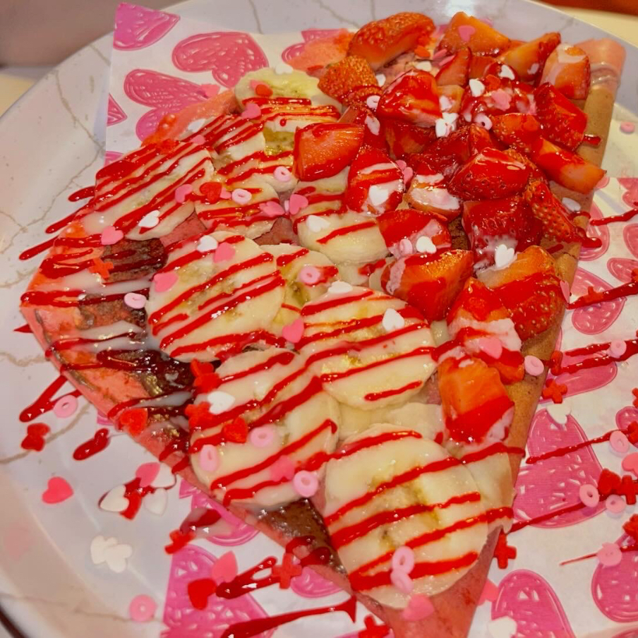 Crepa con avellana,lechera,fresa,plátano y decoración rosa