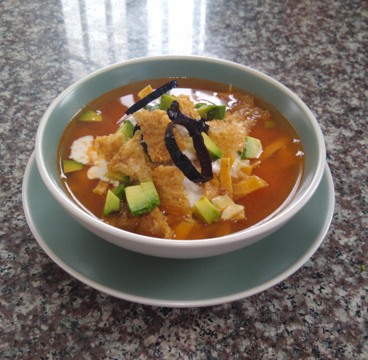 Caldo receta de la casa, acompañado con pollo, tiras de tortilla, queso manchego, aguacate, chicharrón, crema y chile seco.