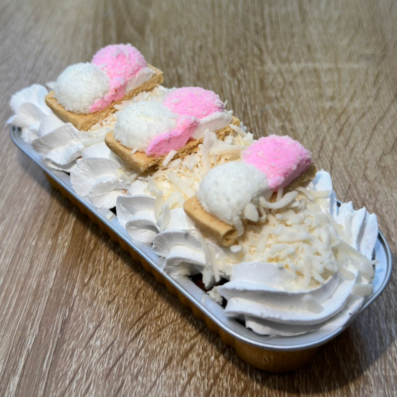 Pan de vainilla, tres leches, crocante de chocolate, crema batida, coco rallado y galleta arcoiris.