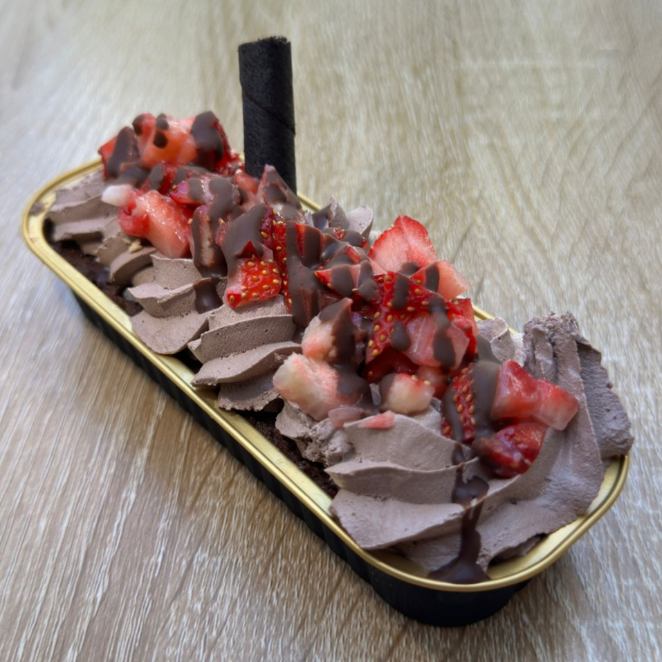 pan de chocolate, tres leches, crocante de chocolate, crema batida, crema Nutella y fresa natural cubiertas