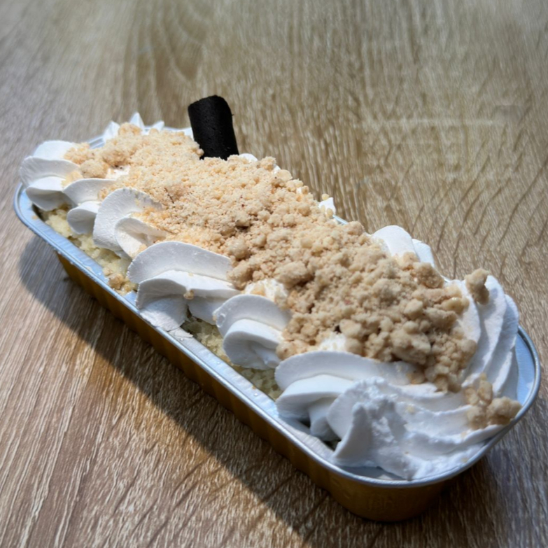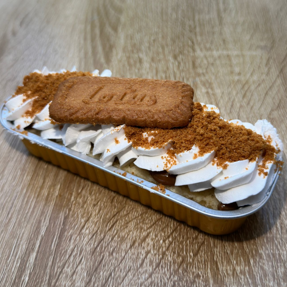 pan de vainilla, tres leches, crema batida, dulce de leche y galleta Lotus