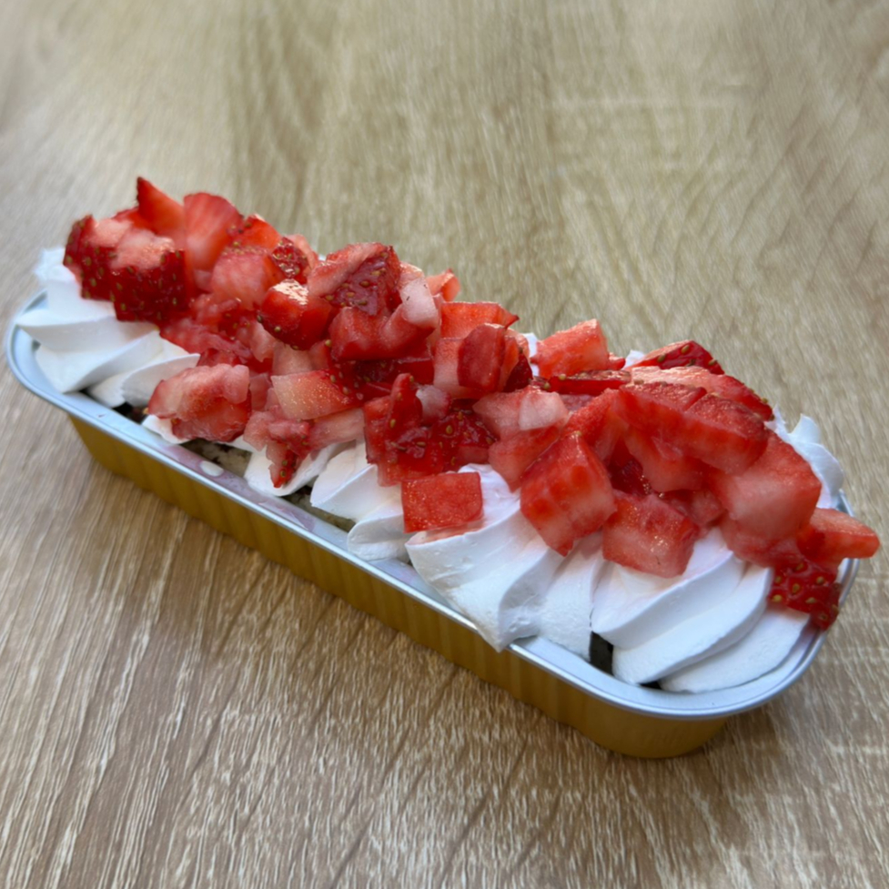 Pan de vainilla, tres leches, crocante de chocolate, crema batida y fresa natural.