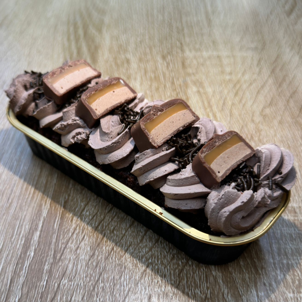 Pan de chocolate, tres leches, crocante de chocolate, crema batida de chocolate y Milky Way.