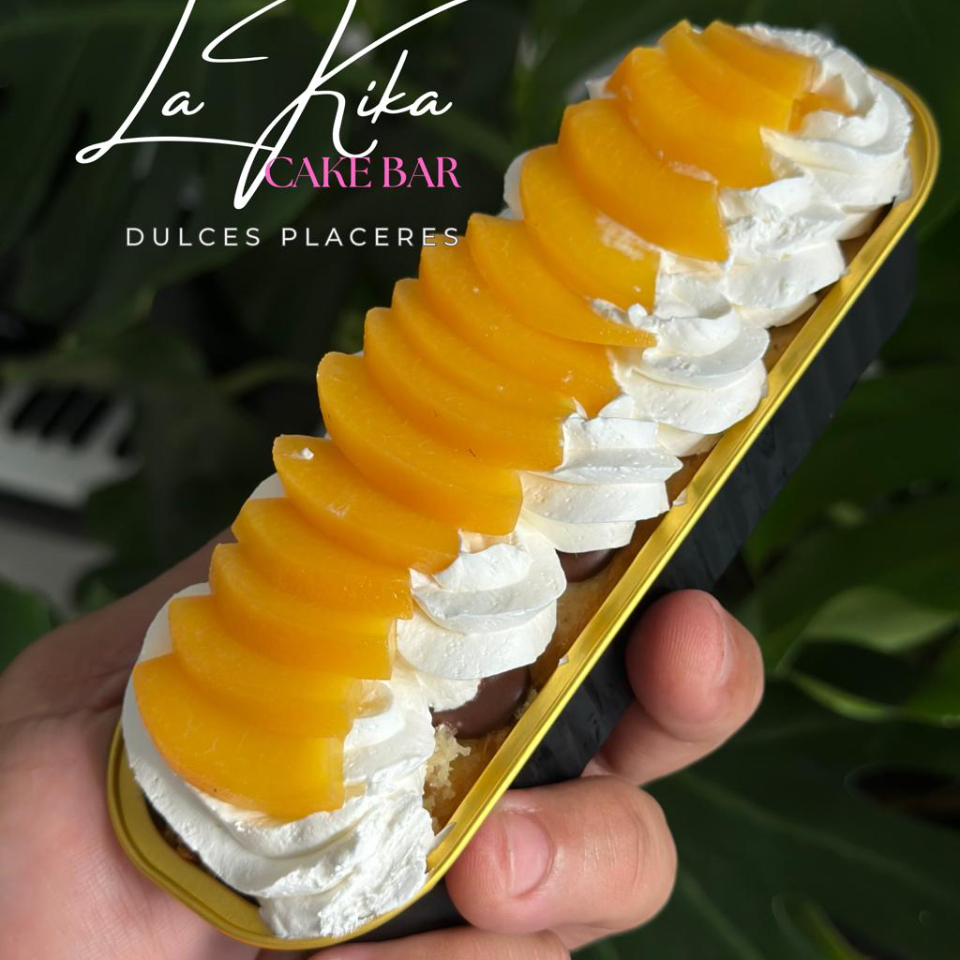 Pan de vainilla, tres leches, crocante de chocolate, crema batida y Durazno .