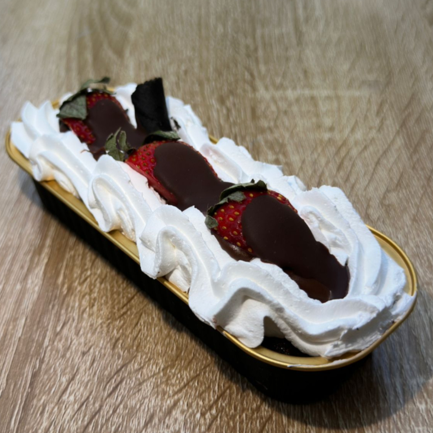 Pan de chocolate, tres leches, crocante de chocolate, crema batida de chocolate, fresa natural y chocolate líquido y barquillo de chocolate.