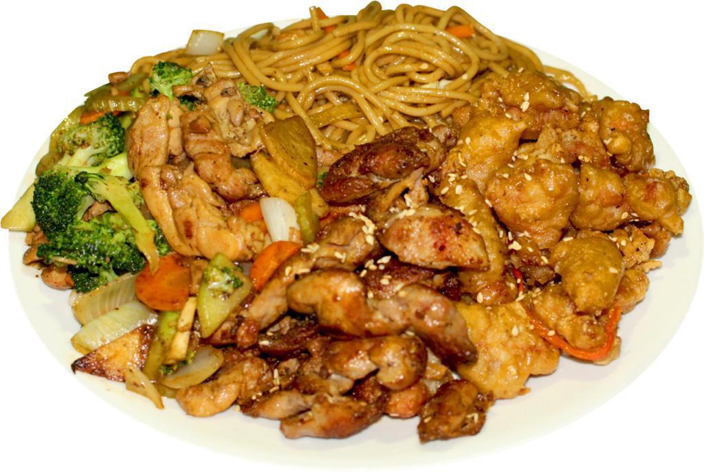 Incluye 2 guisos y un complemento a elegir, salsa agridulce, soya y picante
