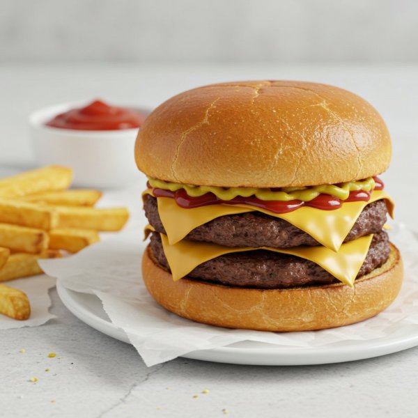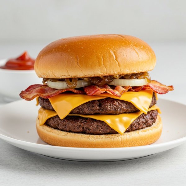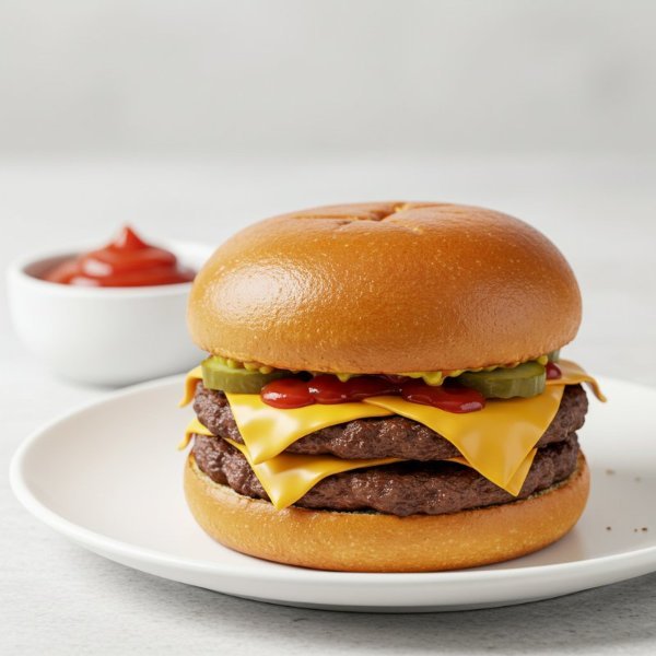 Dos carnes smashed y sazón de la casa, queso americano, pepinillos, cebolla asada, mayonesa, ketchup y mostaza brown sobre pan brioche tostado.