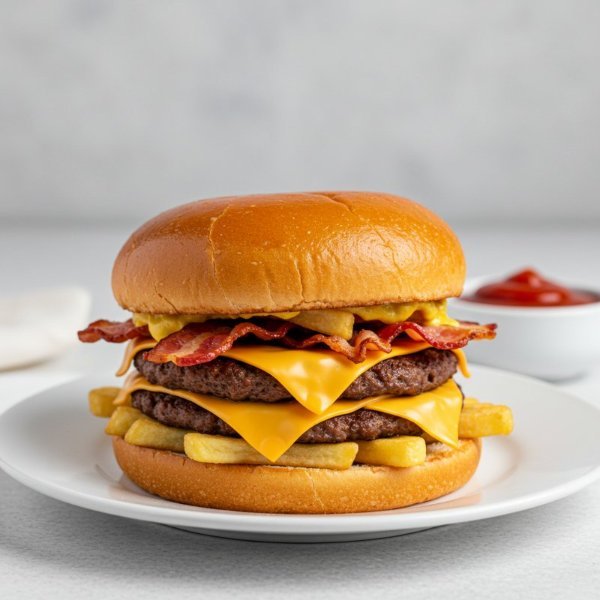 Dos carnes smashed, queso americano, mayonesa, ketchup, mostaza brown, tocino y papas fritas sobre pan brioche tostado.